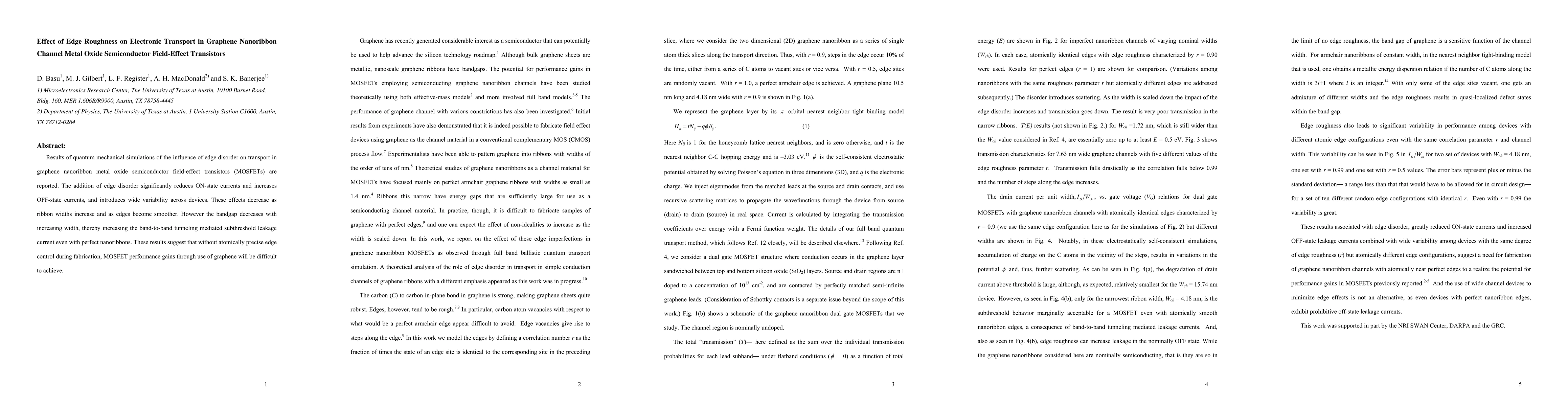 Results of quantum mechanical simulations of the influence of edge disorder on transport in graphene nanoribbon metal oxide semiconductor field-effect transistors (MOSFETs) are reported. The addition of edge disorder significantly reduces ON-state currents and increases OFF-state currents, and introduces wide variability across devices. These effects decrease as ribbon widths increase and as edges become smoother. However the bandgap decreases with increasing width, thereby increasing the band-to-band tunneling mediated subthreshold leakage current even with perfect nanoribbons. These results suggest that without atomically precise edge control during fabrication, MOSFET performance gains through use of graphene will be difficult to achieve.