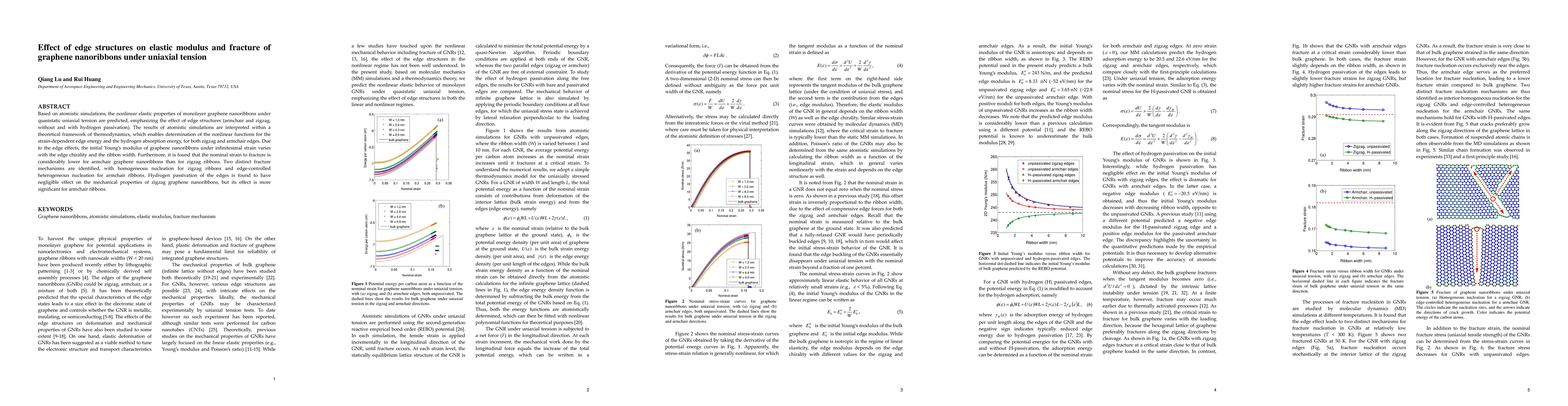 This study uses atomistic simulations to analyze how edge structures influence the elastic modulus and fracture behavior of graphene nanoribbons under tension. It finds that armchair edges result in lower fracture strains compared to zigzag edges, with hydrogen passivation having a more notable effect on armchair nanoribbons.