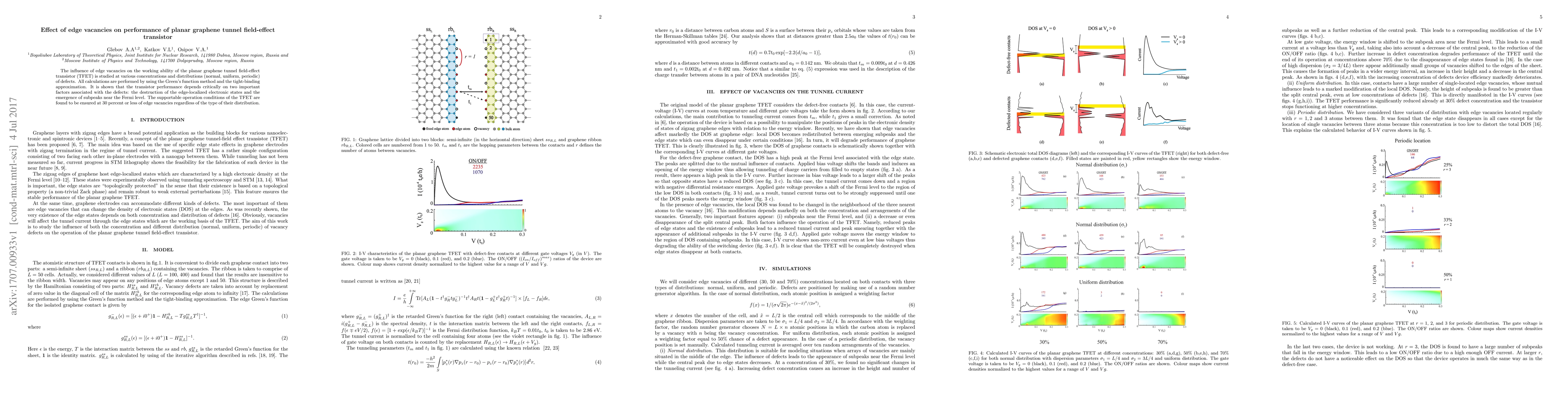 This research investigates how edge vacancies impact the performance of planar graphene tunnel field-effect transistors (TFETs) using the Green's function method and tight-binding approximation. It finds that the transistor's functionality is critically affected by the disruption of edge-localized electronic states and the appearance of subpeaks near the Fermi level, with reliable operation achievable at 30% or fewer edge vacancies.