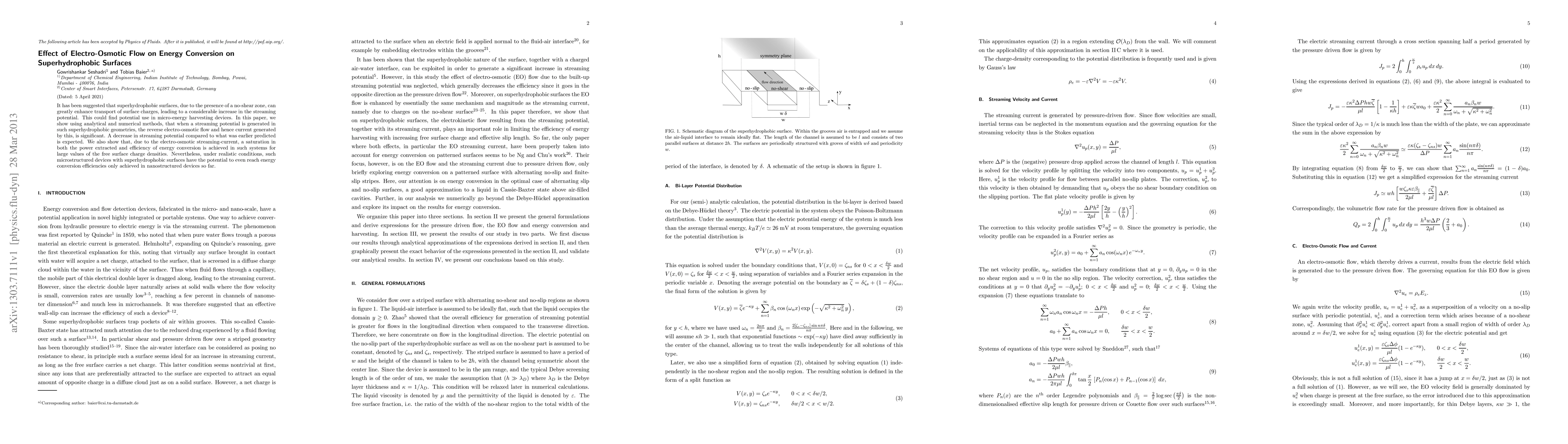 This paper investigates the impact of electro-osmotic flow on energy conversion in superhydrophobic surfaces, demonstrating that reverse electro-osmotic flow significantly influences the generated streaming potential and current. It concludes that while power extraction and efficiency saturate for high charge densities, these microstructured devices may achieve efficiencies comparable to nanostructured devices.