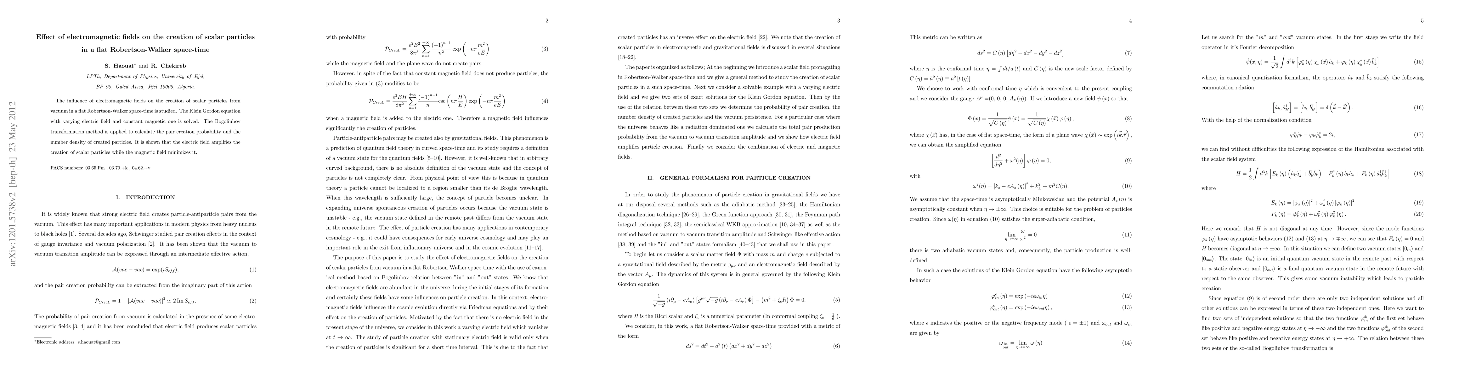 Summary: This study investigates how electromagnetic fields affect scalar particle creation in a flat Robertson-Walker space-time, finding that electric fields enhance while magnetic fields reduce the creation rate, using the Klein Gordon equation and Bogoliubov transformation.