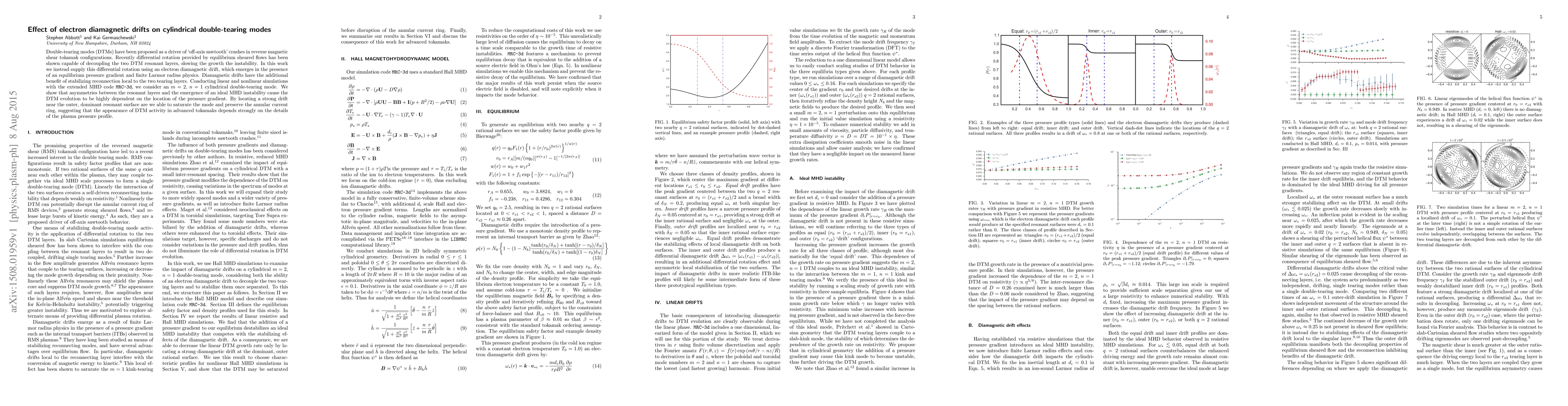This paper investigates the impact of electron diamagnetic drifts on cylindrical double-tearing modes (DTMs) in tokamak plasmas, demonstrating that these drifts can stabilize the modes by decoupling resonant layers and influencing the mode's evolution based on the pressure gradient's location. Simulations show that positioning a strong drift near the dominant resonant surface can saturate the DTM and maintain the annular current ring.