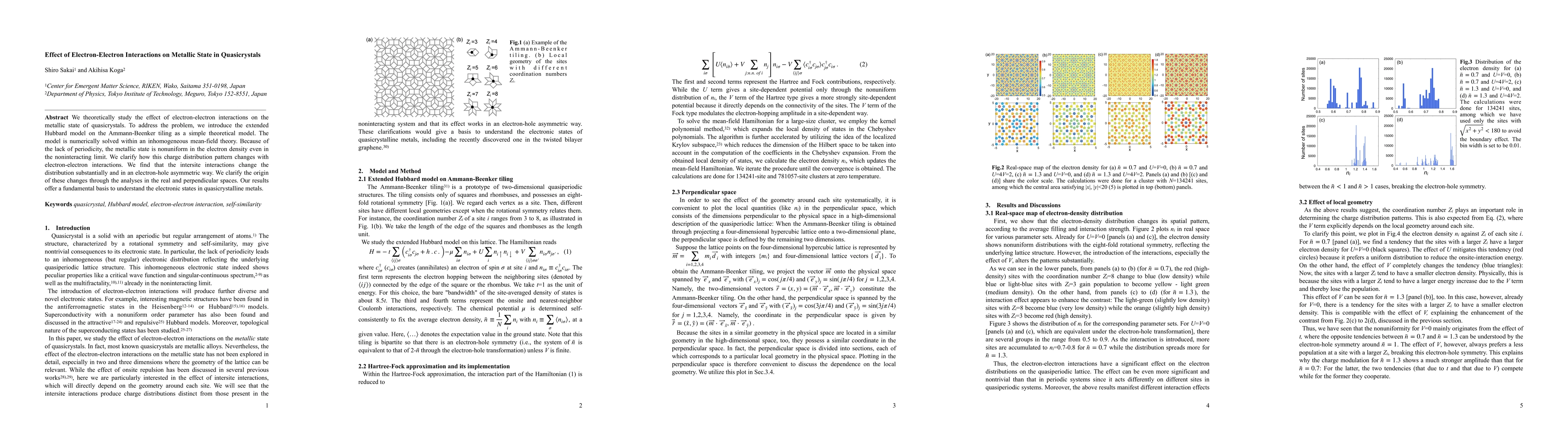 This paper investigates the impact of electron-electron interactions on the metallic state of quasicrystals using the extended Hubbard model on Ammann-Beenker tiling. It finds that intersite interactions significantly alter the nonuniform electron density distribution, leading to electron-hole asymmetric changes, providing fundamental insights into quasicrystalline metallic states.