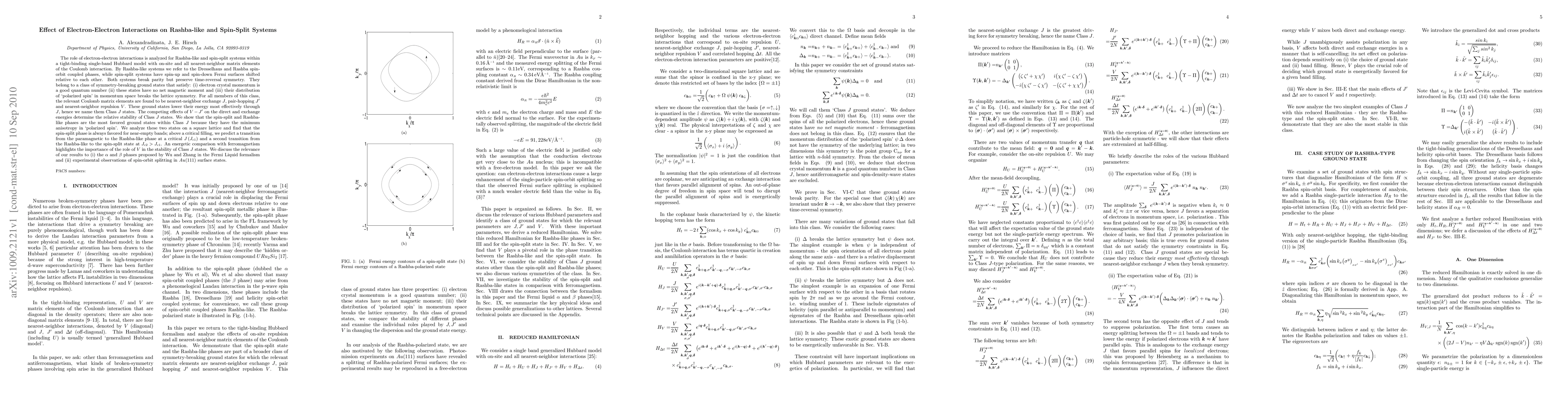 The role of electron-electron interactions is analyzed for Rashba-like and spin-split systems within a tight-binding single-band Hubbard model with on-site and all nearest-neighbor matrix elements of the Coulomb interaction. By Rashba-like systems we refer to the Dresselhaus and Rashba spin-orbit coupled phases; spin-split systems have spin-up and spin-down Fermi surfaces shifted relative to each other. Both systems break parity but preserve time-reversal symmetry. They belong to a class of symmetry-breaking ground states that satisfy: (i) electron crystal momentum is a good quantum number (ii) these states have no net magnetic moment and (iii) their distribution of `polarized spin' in momentum space breaks the lattice symmetry. In this class, the relevant Coulomb matrix elements are found to be nearest-neighbor exchange $J$, pair-hopping $J'$ and nearest-neighbor repulsion $V$. These ground states lower their energy most effectively through $J$, hence we name them Class $J$ states. The competing effects of $V-J'$ on the direct and exchange energies determine the relative stability of Class $J$ states. We show that the spin-split and Rashba-like phases are the most favored ground states within Class $J$ because they have the minimum anisotropy in `polarized spin'. On a square lattice we find that the spin-split phase is always favored for near-empty bands; above a critical filling, we predict a transition from the paramagnetic to the Rashba-like phase at $ J_{c1}$ and a second transition to the spin-split state at $J_{c2}>J_{c1}$. An energetic comparison with ferromagnetism highlights the importance of the role of $V$ in the stability of Class $J$ states. We discuss the relevance of our results to (i) the $\alpha$ and $\beta$ phases proposed by Wu and Zhang in the Fermi Liquid formalism and (ii) experimental observations of spin-orbit splitting in \emph{Au}(111) surface states.