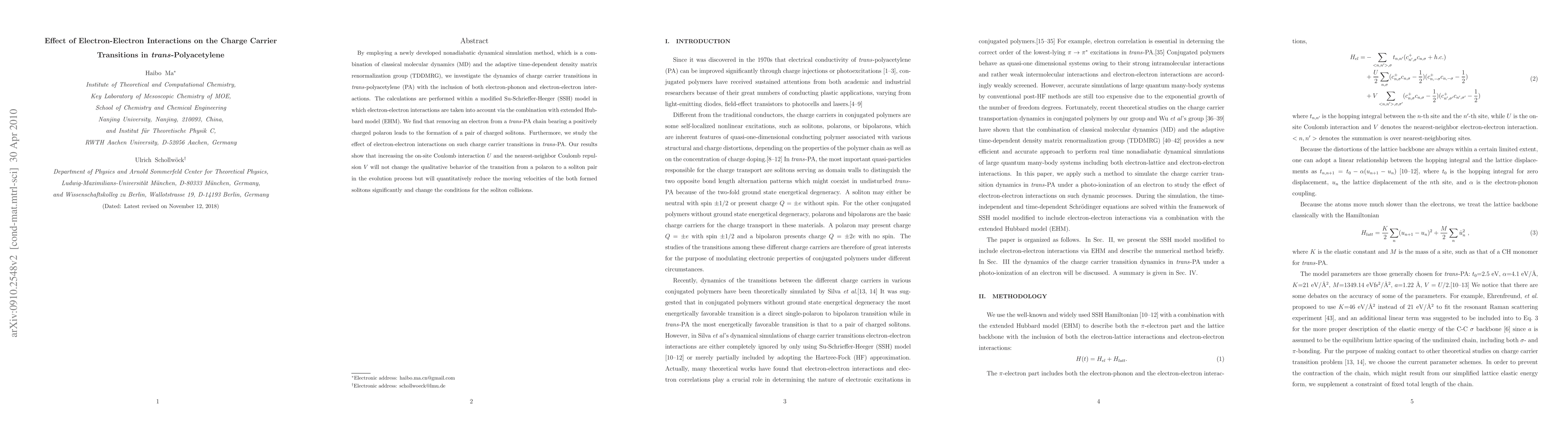 This study uses a hybrid simulation method combining classical MD and TDDMRG to explore charge carrier transitions in trans-polyacetylene, revealing that electron-electron interactions do not alter the transition from polaron to soliton pair but significantly reduce soliton velocities and modify collision conditions.