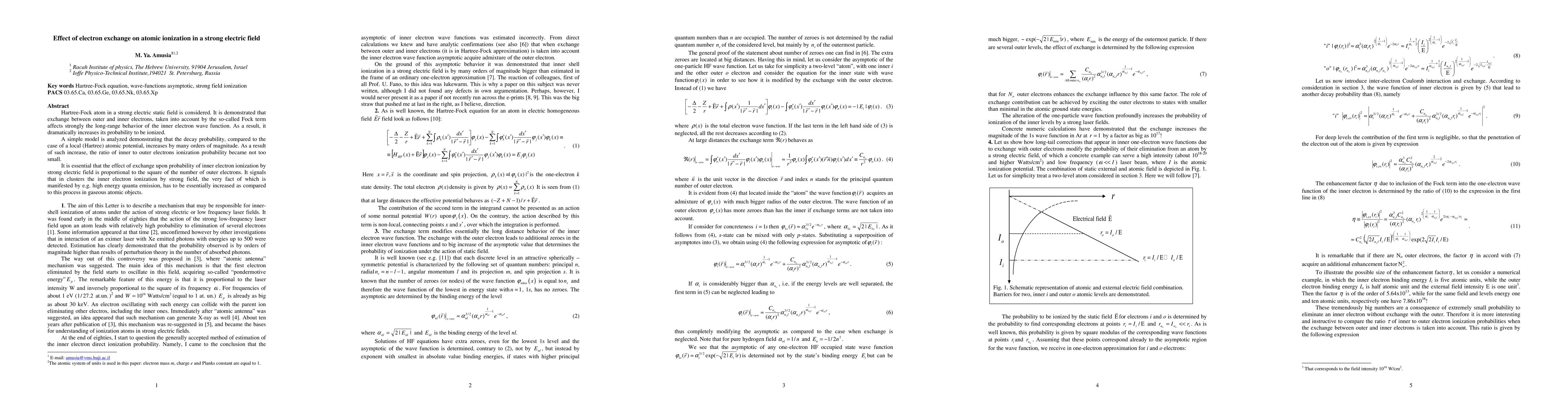 This paper investigates how electron exchange, particularly the Fock term, influences atomic ionization in a strong electric field. It finds that exchange between outer and inner electrons significantly increases the ionization probability of inner electrons, with the effect being proportional to the square of the number of outer electrons, thus enhancing ionization in clusters compared to isolated atoms.