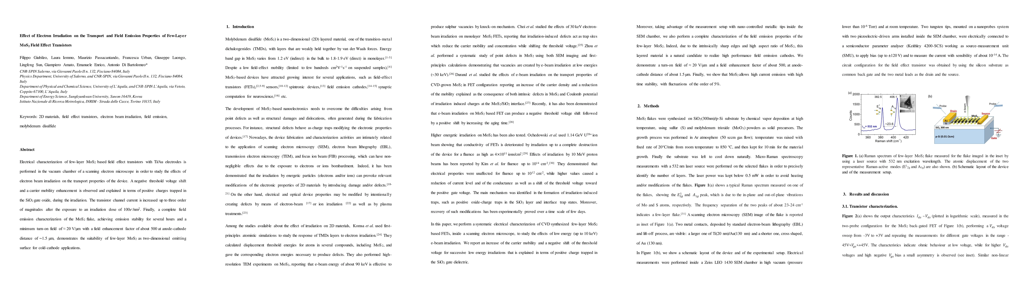 This study investigates the impact of electron beam irradiation on the transport properties and field emission of few-layer MoS2 field effect transistors, revealing a significant increase in channel current and a minimum turn-on field, showcasing MoS2's potential for cold-cathode applications. The irradiation induces a negative threshold voltage shift and enhances carrier mobility due to trapped charges in the SiO2 gate oxide.