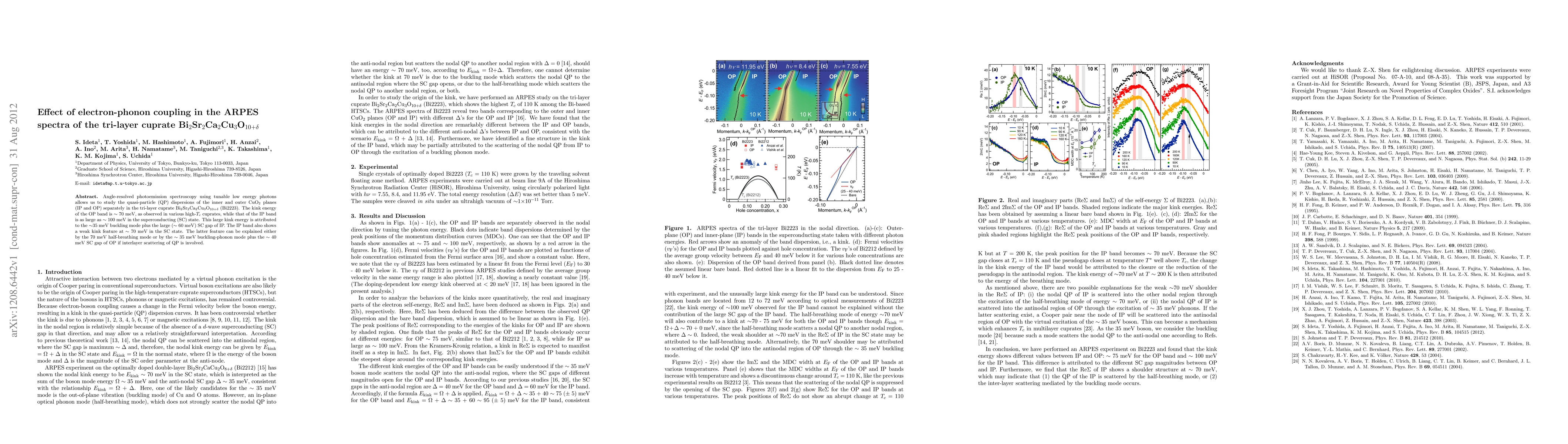 Researchers studied the properties of electrons in a tri-layer cuprate using ARPES spectroscopy, finding that the inner and outer CuO2 planes have different kink energies in their spectra, which can be explained by varying degrees of electron-phonon coupling.
