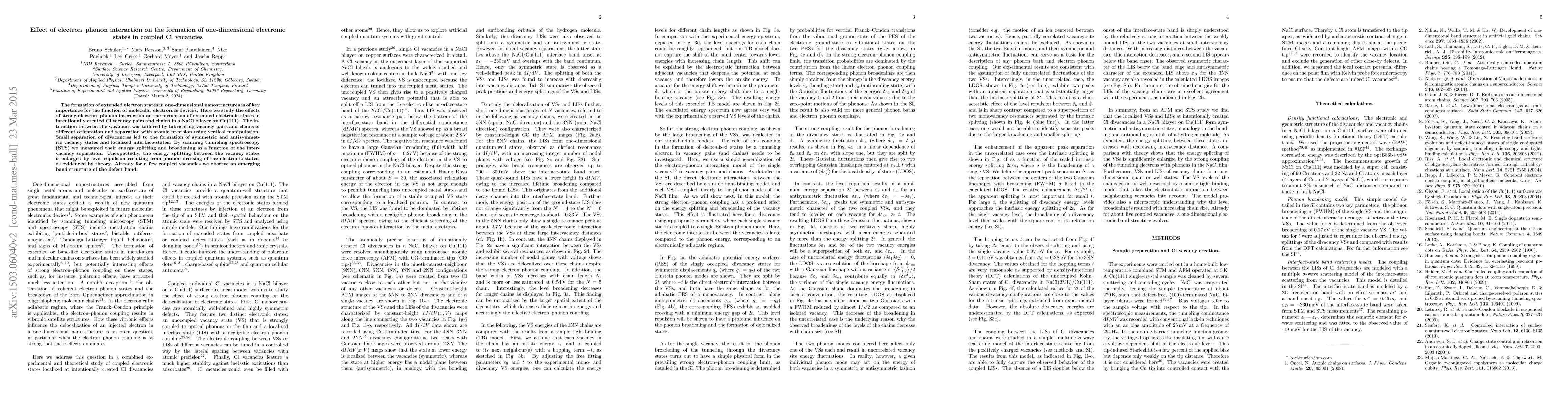 This study investigates how strong electron-phonon interactions influence the formation of extended electronic states in Cl vacancy pairs and chains in a NaCl bilayer on Cu(111). The research reveals that phonon dressing of electronic states leads to an enlarged energy splitting between vacancy states, demonstrating the formation of a band structure in just a few coupled vacancies.