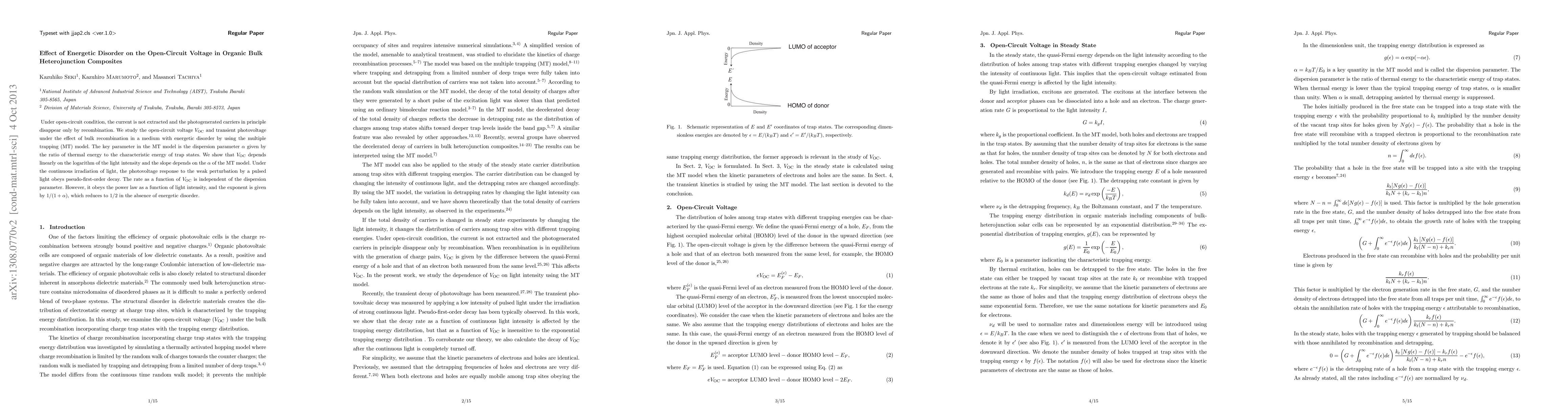 This study investigates the relationship between energetic disorder and open-circuit voltage ($V_{\rm OC}$) in organic bulk heterojunction composites using the multiple trapping model. The results show that $V_{\rm OC}$ linearly depends on the logarithm of light intensity and the slope is influenced by the dispersion parameter $\alpha$.