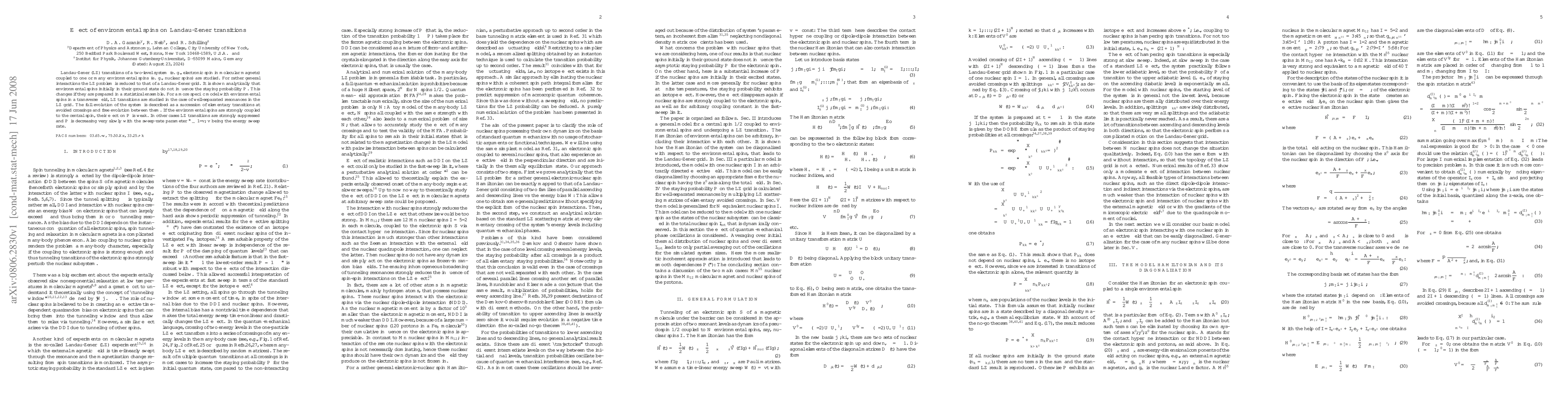 This paper investigates how environmental spins affect Landau-Zener transitions in a two-level system, finding that ground state spins have no impact on transition probabilities. However, when environmental spins are in a statistical ensemble or strongly coupled, they significantly suppress transitions, leading to a slow decrease in staying probability with increasing sweep rate.