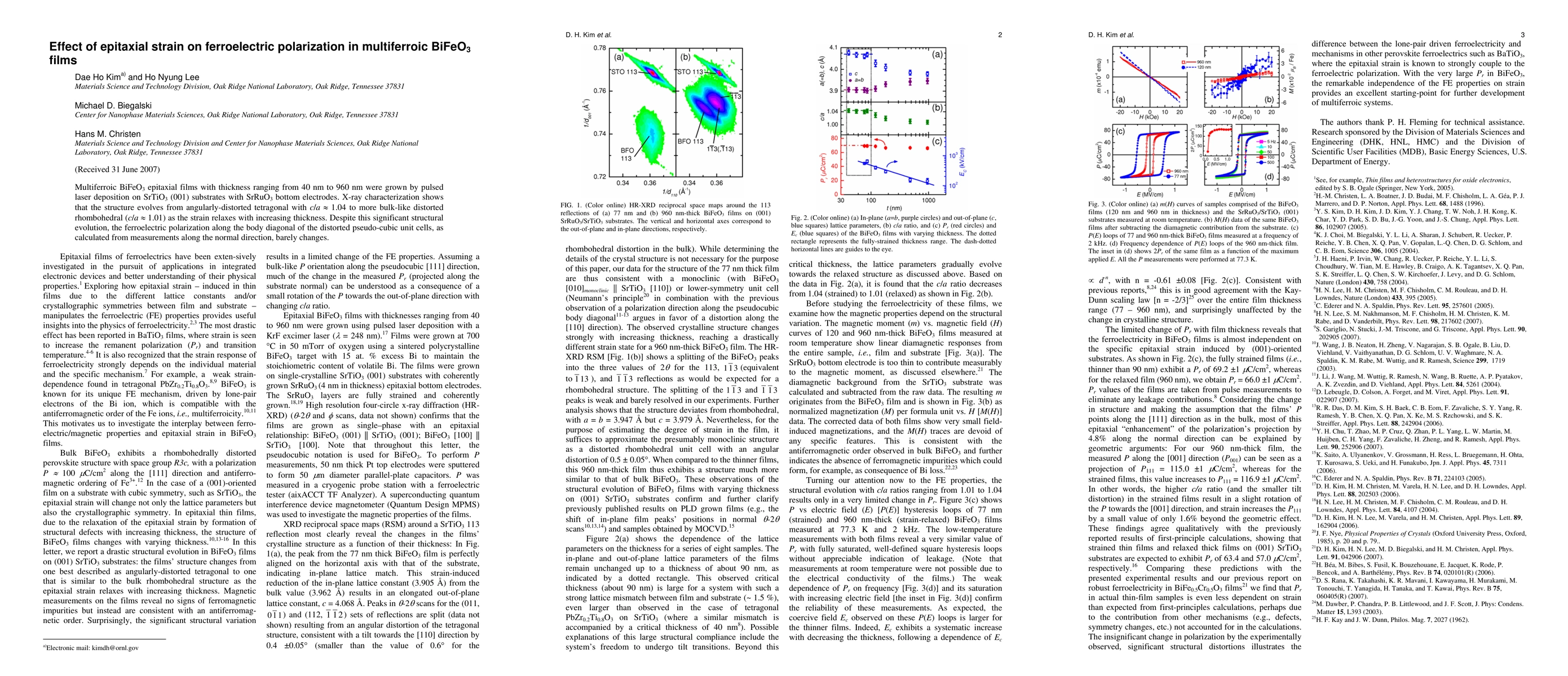 Summary: Epitaxial BiFeO3 films grown on SrTiO3 substrates exhibit structural evolution from angularly-distorted tetragonal to bulk-like rhombohedral with increasing thickness, but show minimal change in ferroelectric polarization despite significant strain relaxation.