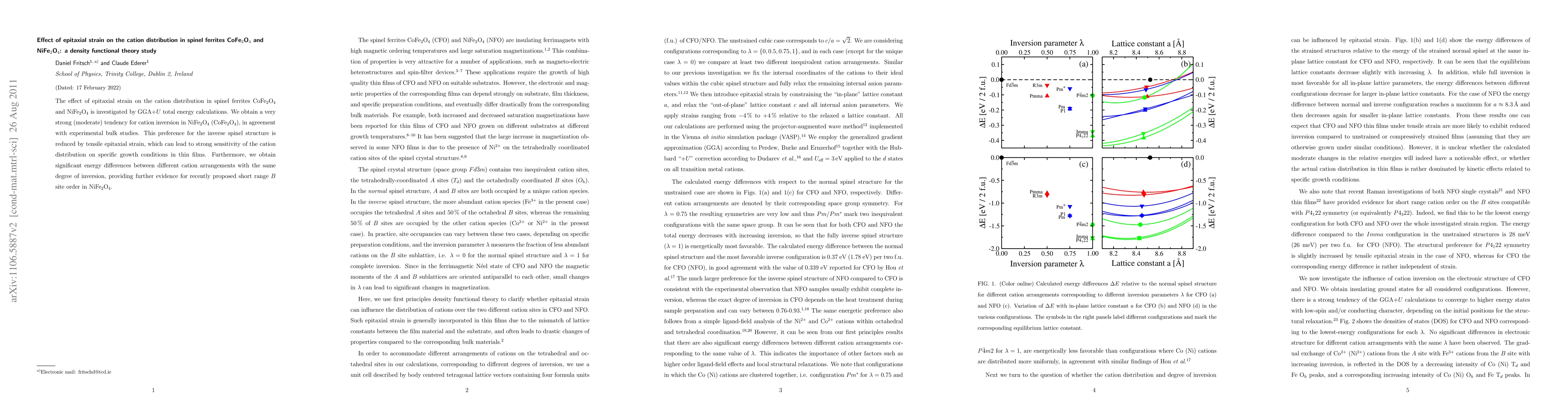 This study uses density functional theory to investigate how epitaxial strain affects the cation distribution in spinel ferrites CoFe2O4 and NiFe2O4, finding a strong tendency for cation inversion in NiFe2O4 and a moderate tendency in CoFe2O4, which is reduced by tensile strain, highlighting the sensitivity of cation distribution to growth conditions in thin films.