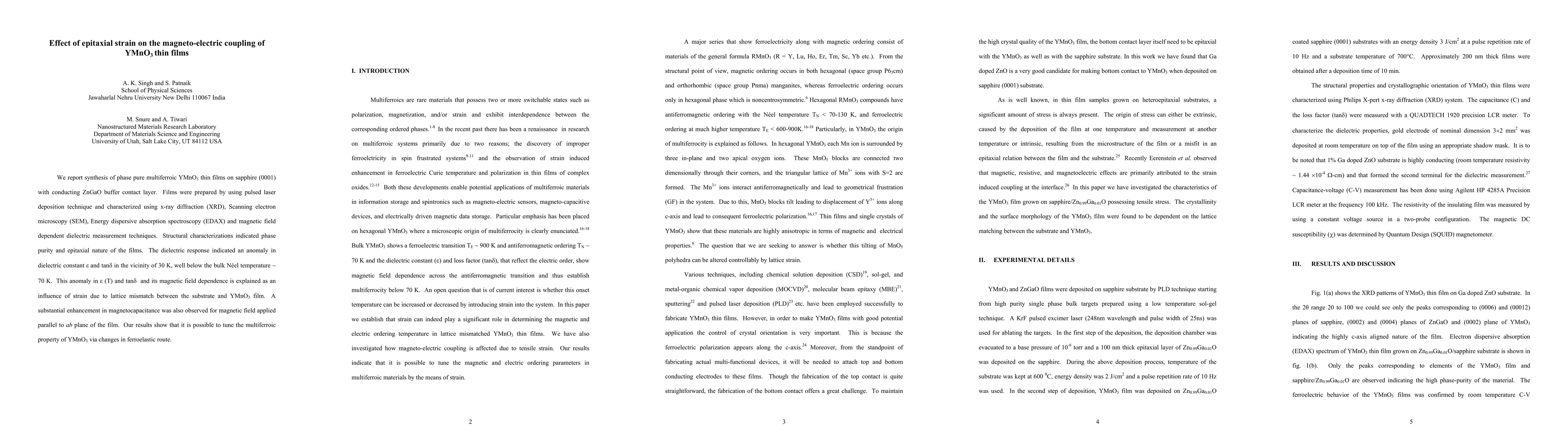 This paper reports the synthesis of phase-pure YMnO3 thin films on sapphire substrates using pulsed laser deposition, demonstrating enhanced magnetocapacitance due to epitaxial strain, showing the potential to tune YMnO3's multiferroic properties via strain-induced effects.