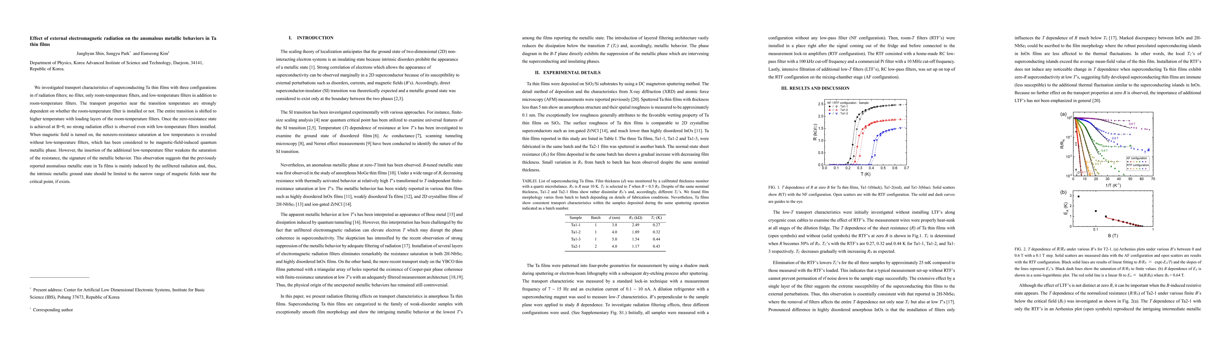 We investigated transport characteristics of superconducting Ta thin films with three configurations in rf radiation filters; no filter, only room-temperature filters, and low-temperature filters in addition to room-temperature filters. The transport properties near the transition temperature are strongly dependent on whether the room-temperature filter is installed or not. The entire transition is shifted to higher temperature with loading layers of the room-temperature filters. Once the zero-resistance state is achieved at B=0, no strong radiation effect is observed even with low-temperature filters installed. When magnetic field is turned on, the nonzero-resistance saturation at low temperatures is revealed without low-temperature filters, which has been considered to be magnetic-field-induced quantum metallic phase. However, the insertion of the additional low-temperature filter weakens the saturation of the resistance, the signature of the metallic behavior. This observation suggests that the previously reported anomalous metallic state in Ta films is mainly induced by the unfiltered radiation and, thus, the intrinsic metallic ground state should be limited to the narrow range of magnetic fields near the critical point, if exists.