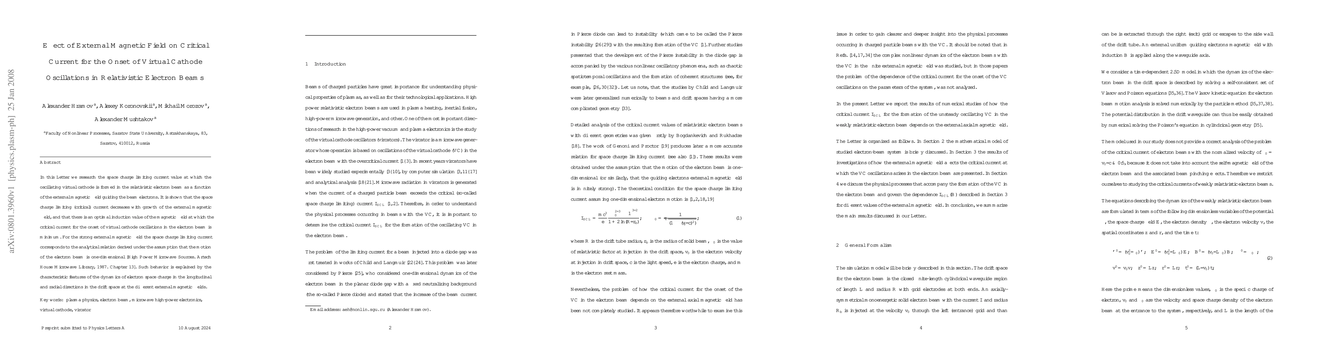 This paper investigates how an external magnetic field influences the critical current for the onset of virtual cathode oscillations in relativistic electron beams, finding that the critical current decreases with increasing magnetic field strength, with an optimal magnetic induction minimizing this current. The behavior is attributed to the dynamics of electron space charge under varying magnetic fields.