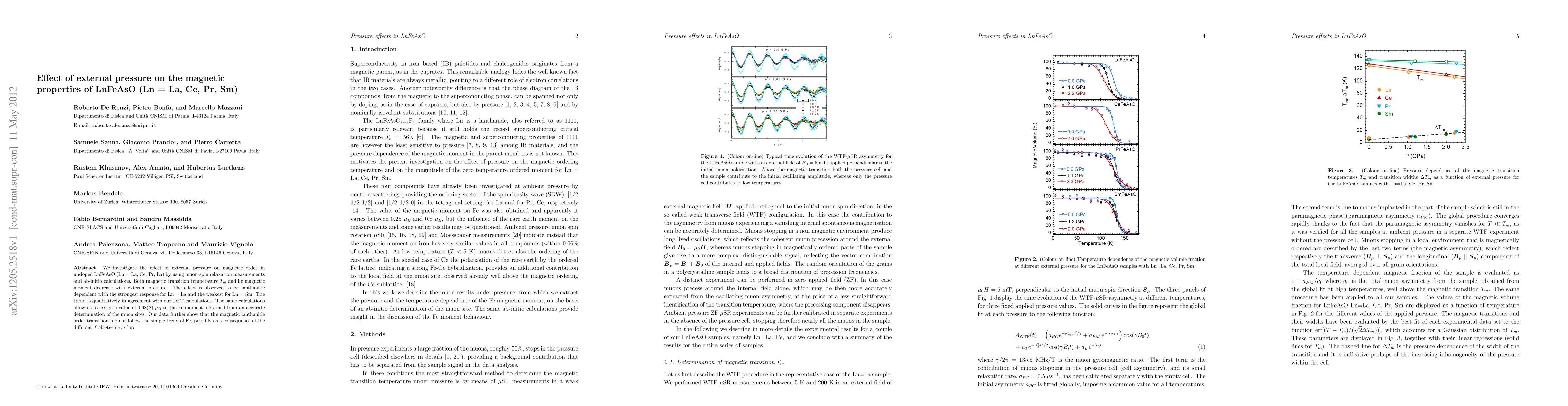 We investigate the effect of external pressure on magnetic order in undoped LnFeAsO (Ln = La, Ce, Pr, La) by using muon-spin relaxation measurements and ab-initio calculations. Both magnetic transition temperature $T_m$ and Fe magnetic moment decrease with external pressure. The effect is observed to be lanthanide dependent with the strongest response for Ln = La and the weakest for Ln = Sm. The trend is qualitatively in agreement with our DFT calculations. The same calculations allow us to assign a value of 0.68(2) $\mu_B$ to the Fe moment, obtained from an accurate determination of the muon sites. Our data further show that the magnetic lanthanide order transitions do not follow the simple trend of Fe, possibly as a consequence of the different $f$-electron overlap.