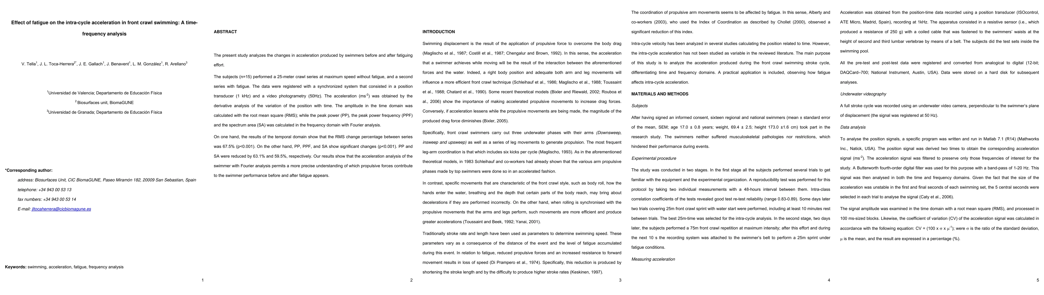 The present study analyzes the changes in acceleration produced by swimmers before and after fatiguing effort. The subjects (n=15) performed a 25-meter crawl series at maximum speed without fatigue, and a second series with fatigue. The data were registered with a synchronized system that consisted in a position transducer (1 kHz) and a video photogrametry (50Hz). The acceleration (ms-2) was obtained by the derivative analysis of the variation of the position with time. The amplitude in the time domain was calculated with the root mean square (RMS); while the peak power (PP), the peak power frequency (PPF) and the spectrum area (SA) was calculated in the frequency domain with Fourier analysis. On one hand, the results of the temporal domain show that the RMS change percentage between series was 67.5% (p<0.001). On the other hand, PP, PPF, and SA show significant changes (p<0.001). PP and SA were reduced by 63.1% and 59.5%, respectively. Our results show that the acceleration analysis of the swimmer with Fourier analysis permits a more precise understanding of which propulsive forces contribute to the swimmer performance before and after fatigue appears.