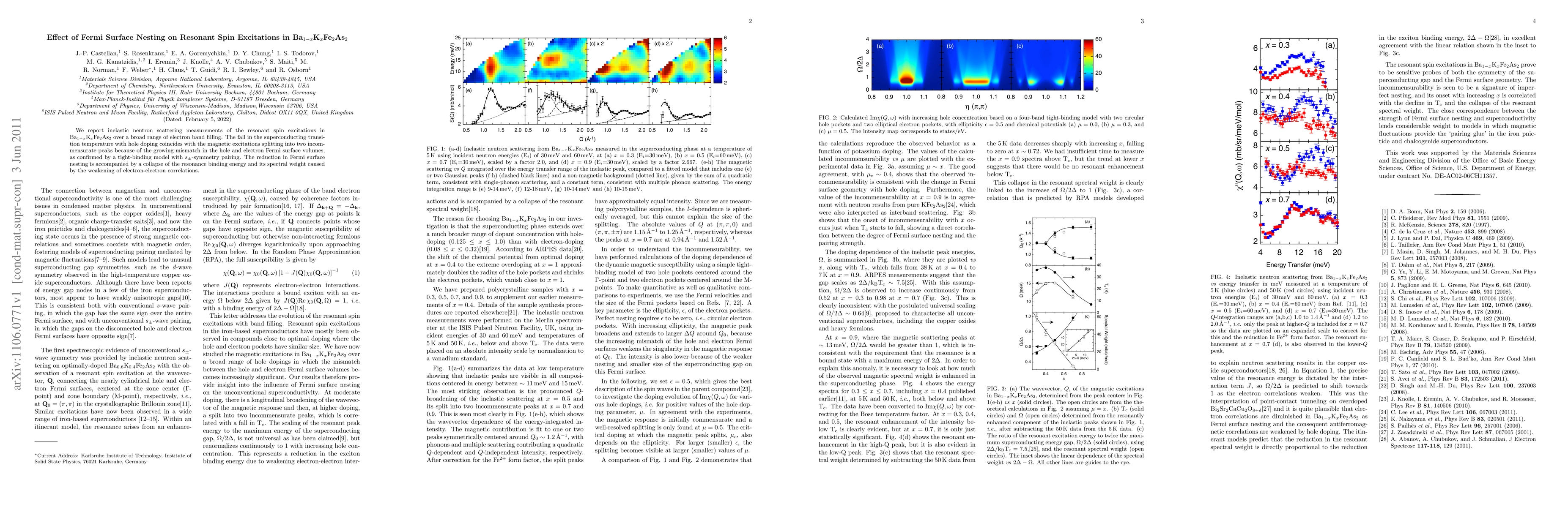Inelastic neutron scattering reveals that as hole doping in Ba1-xKxFe2As2 increases, superconducting transition temperature drops. This corresponds with magnetic excitations splitting into two incommensurate peaks due to growing Fermi surface volume mismatch. A tight-binding model confirms this, showing reduced resonance binding energy and weight due to weakened electron-electron correlations.