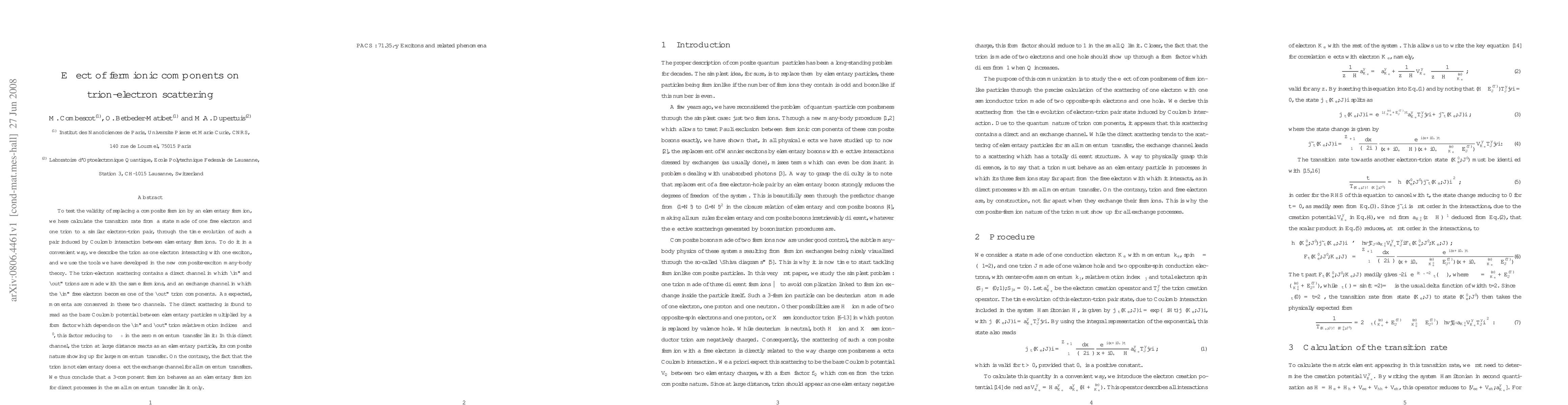 To test the validity of replacing a composite fermion by an elementary fermion, we here calculate the transition rate from a state made of one free electron and one trion to a similar electron-trion pair, through the time evolution of such a pair induced by Coulomb interaction between elementary fermions. To do it in a convenient way, we describe the trion as one electron interacting with one exciton, and we use the tools we have developed in the new composite-exciton many-body theory. The trion-electron scattering contains a direct channel in which ``in'' and ``out'' trions are made with the same fermions, and an exchange channel in which the ``in'' free electron becomes one of the ``out'' trion components. As expected, momenta are conserved in these two channels. The direct scattering is found to read as the bare Coulomb potential between elementary particles multiplied by a form factor which depends on the ``in'' and ``out'' trion relative motion indices $\eta$ and $\eta'$, this factor reducing to $\delta_{\eta\eta'}$ in the zero momentum transfer limit: In this direct channel, the trion at large distance reacts as an elementary particle, its composite nature showing up for large momentum transfer. On the contrary, the fact that the trion is not elementary does affect the exchange channel for all momentum transfers. We thus conclude that a 3-component fermion behaves as an elementary fermion for direct processes in the small momentum transfer limit only.