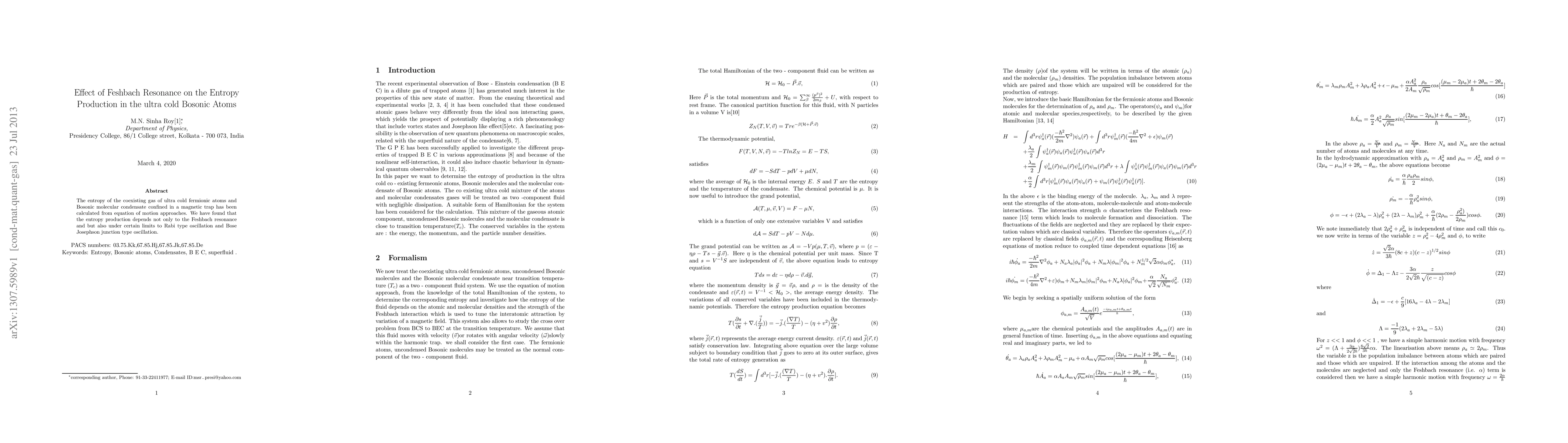 The entropy of the coexisting gas of ultra cold fermionic atoms and Bosonic molecular condensate confined in a magnetic trap has been calculated from equation of motion approaches. We have found that the entropy production depends not only to the Feshbach resonance and but also under certain limits to Rabi type oscillation and Bose Josephson junction type oscillation.
