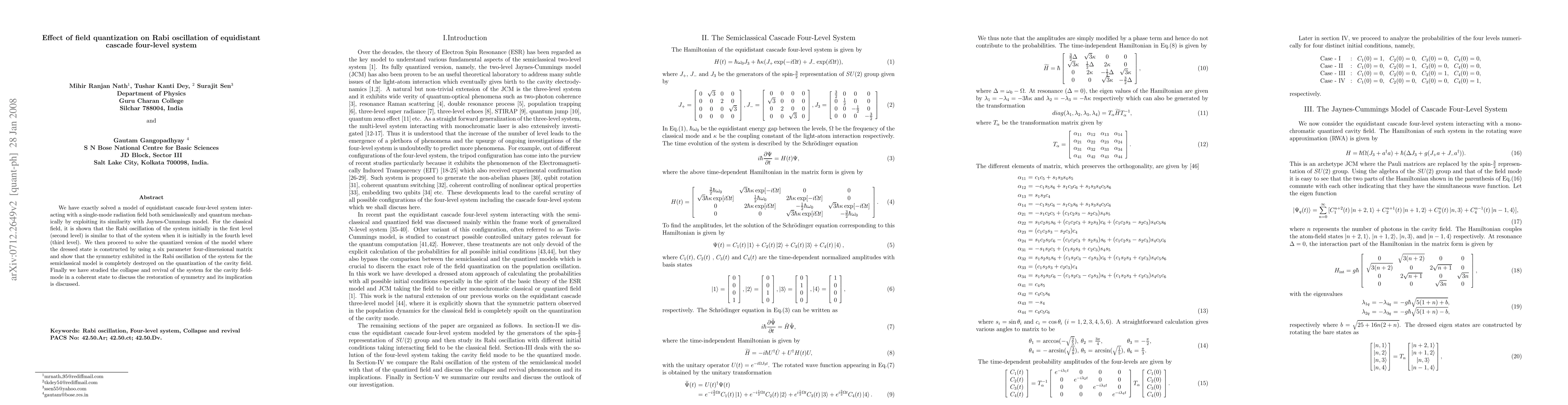 This paper explores the Rabi oscillation in an equidistant cascade four-level system interacting with a single-mode radiation field, showing that symmetry in oscillations is lost upon field quantization. The study also investigates the collapse and revival phenomena in a coherent cavity field-mode, discussing the restoration of symmetry.