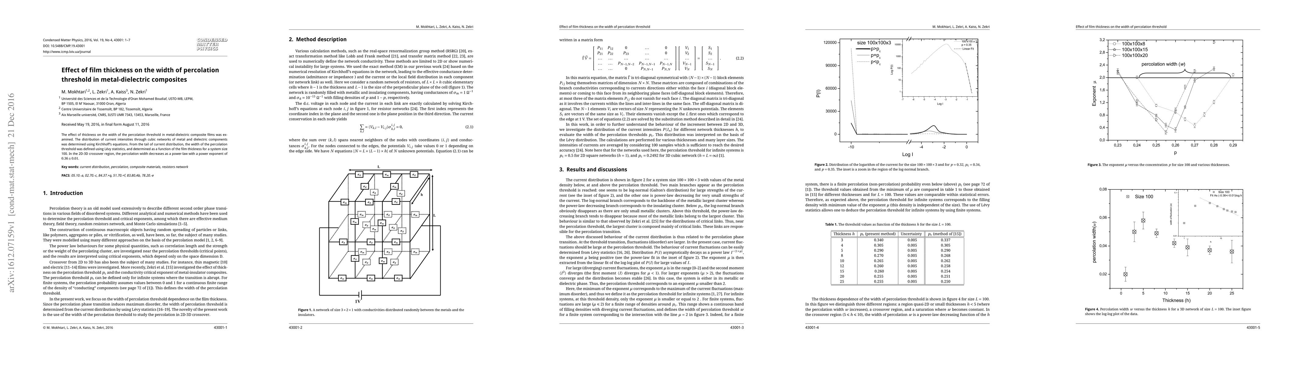 This study investigates the impact of film thickness on the width of the percolation threshold in metal-dielectric composites, using Kirchhoff's equations to model current distribution. The percolation width decreases as a power-law in the 2D-3D crossover region with a power exponent of $0.36\pm 0.01$.