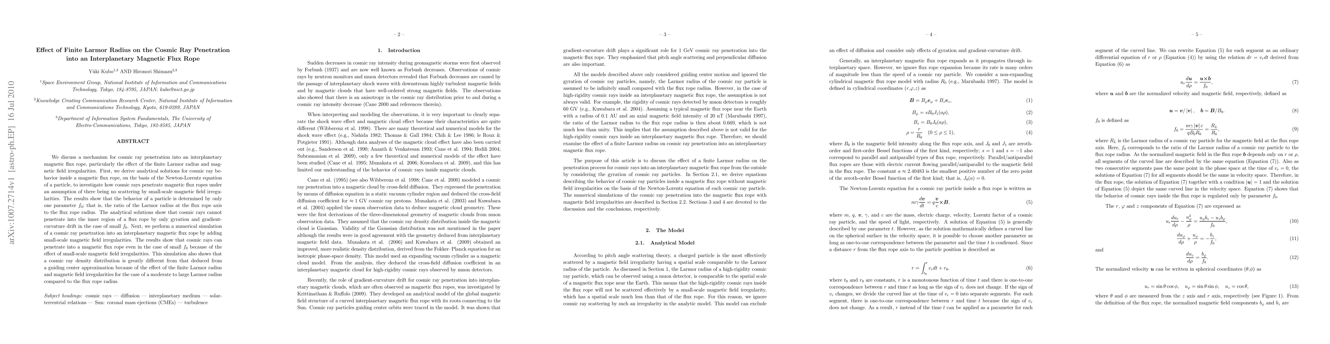 This paper investigates cosmic ray penetration into an interplanetary magnetic flux rope, focusing on the influence of finite Larmor radius and magnetic field irregularities. Analytical solutions and numerical simulations reveal significant deviations in cosmic ray density distribution due to these factors, especially for larger Larmor radii.
