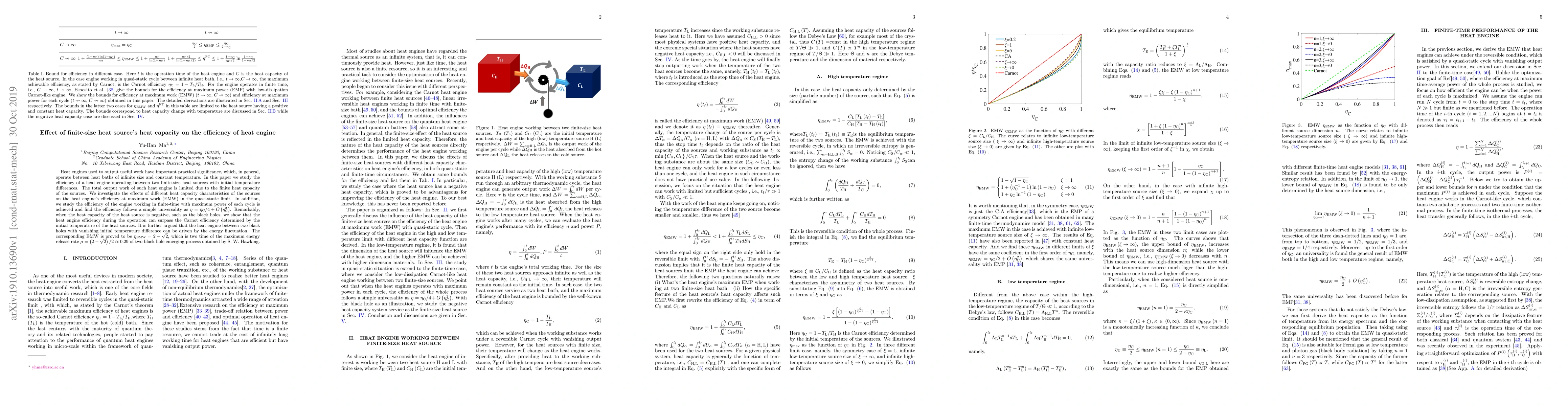 This paper examines the efficiency of a heat engine operating between two finite-size heat sources with varying heat capacities, revealing that the engine's efficiency at maximum work is influenced by the sources' heat capacity characteristics. It also finds that when the heat source has negative heat capacity, like black holes, the engine's efficiency can exceed the Carnot efficiency.