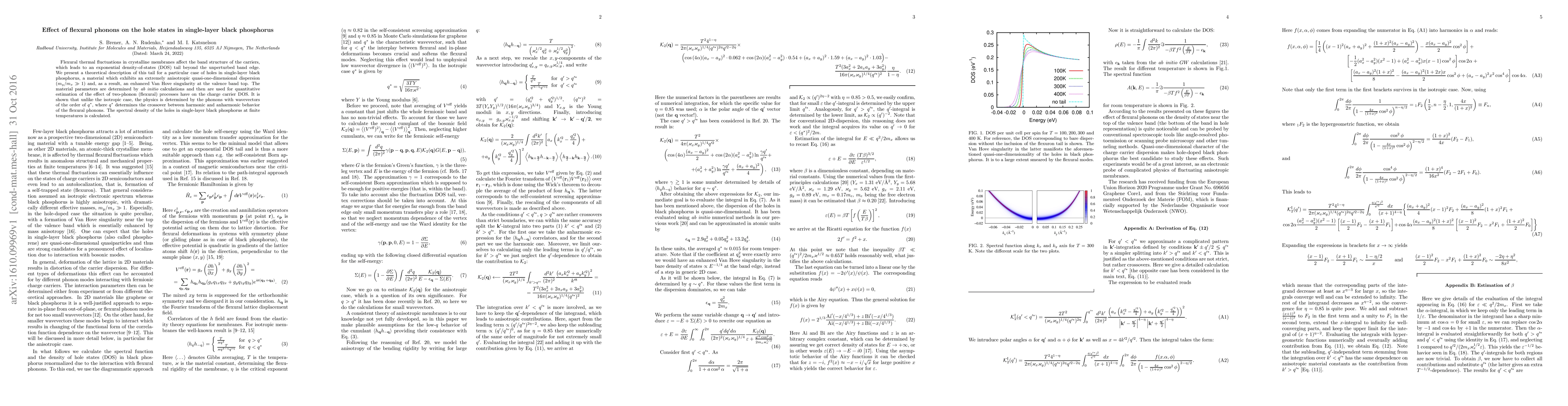Flexural thermal fluctuations in crystalline membranes affect the band structure of the carriers, which leads to an exponential density-of-states (DOS) tail beyond the unperturbed band edge. We present a theoretical description of this tail for a particular case of holes in single-layer black phosphorus, a material which exhibits an extremely anisotropic quasi-one-dimensional dispersion ($m_y/m_x\gg1$) and, as a result, an enhanced Van Hove singularity at the valence band top. The material parameters are determined by {\it ab initio} calculations and then are used for quantitative estimation of the effect of two-phonon (flexural) processes have on the charge carrier DOS. It is shown that unlike the isotropic case, the physics is determined by the phonons with wavevectors of the order of $q^*$, where $q^*$ determines the crossover between harmonic and anharmonic behavior of the flexural phonons. The spectral density of the holes in single-layer black phosphorus at finite temperatures is calculated.
