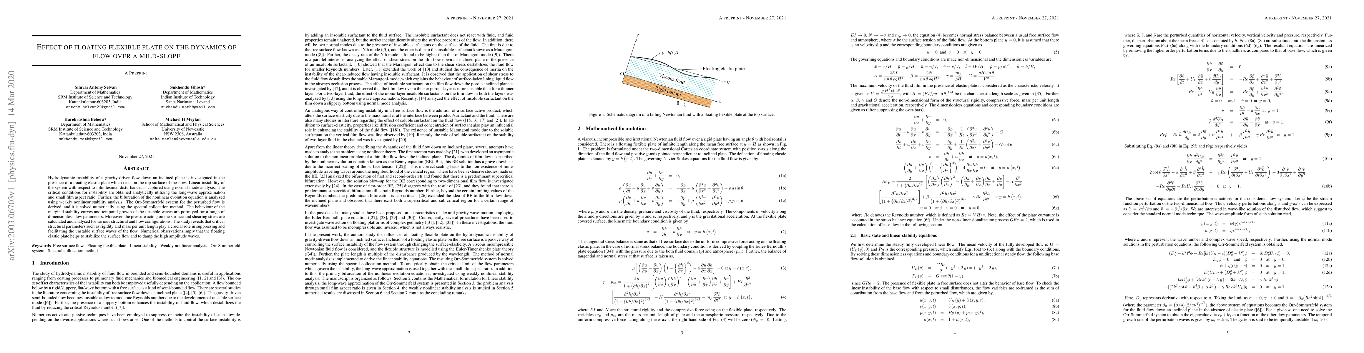 This paper investigates the hydrodynamic instability of gravity-driven flow over a mild slope in the presence of a floating flexible plate, using linear and weakly nonlinear analyses. The study finds that the plate's rigidity and mass significantly influence the suppression of unstable surface waves, stabilizing the flow.