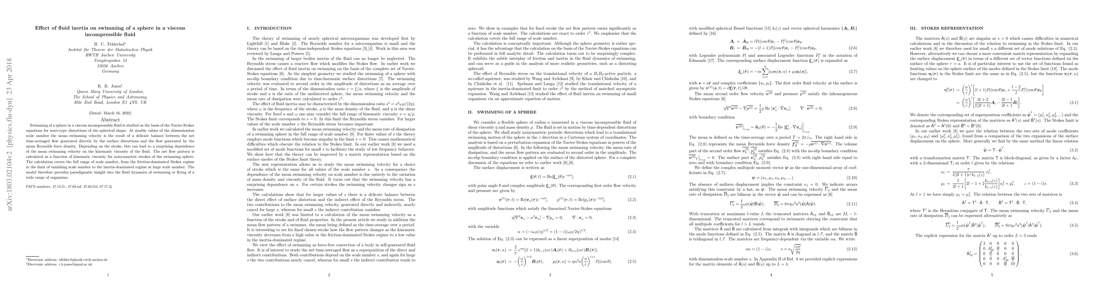 This paper investigates the swimming dynamics of a sphere in a viscous incompressible fluid, revealing how fluid inertia influences mean swimming velocity. It finds that at high scale numbers, swimming velocity balances surface distortions and Reynolds forces, leading to complex viscosity dependencies.