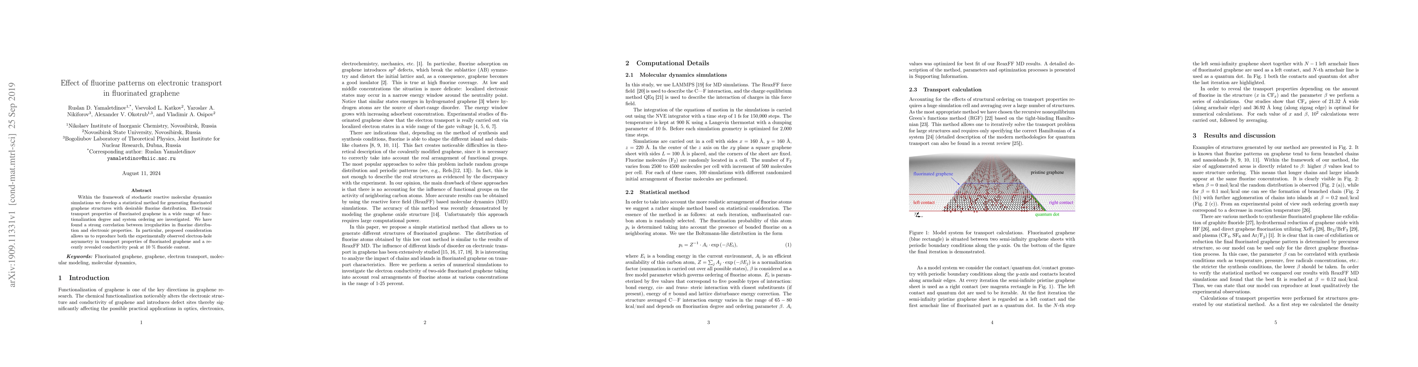 This research utilizes stochastic reactive molecular dynamics simulations to generate fluorinated graphene structures and investigates their electronic transport properties. It finds that irregular fluorine distribution significantly affects these properties, explaining electron-hole asymmetry and a conductivity peak at 10% fluoride content.