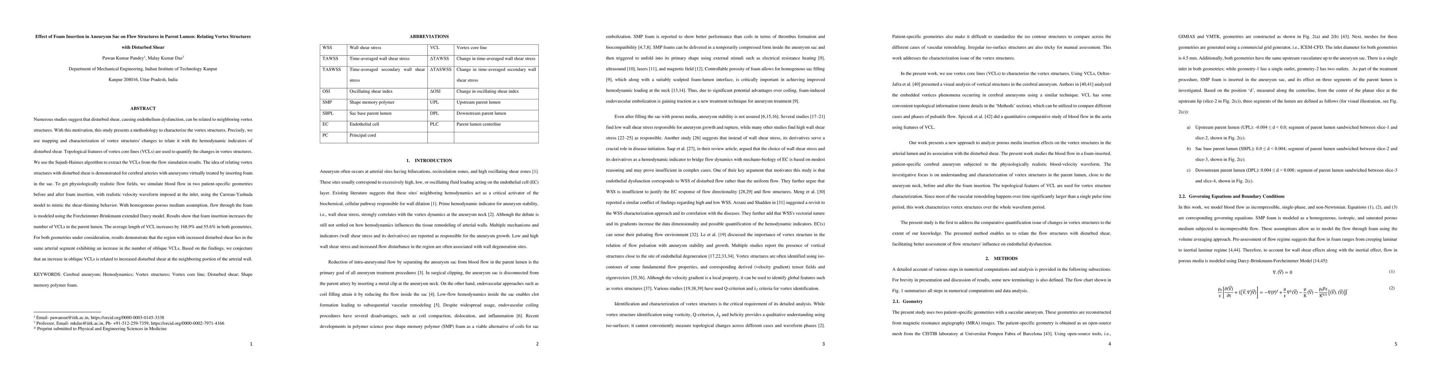 Numerous studies suggest that disturbed shear, causing endothelium dysfunction, can be related to neighboring vortex structures. With this motivation, this study presents a methodology to characterize the vortex structures. Precisely, we use mapping and characterization of vortex structures' changes to relate it with the hemodynamic indicators of disturbed shear. Topological features of vortex core lines (VCLs) are used to quantify the changes in vortex structures. We use the Sujudi-Haimes algorithm to extract the VCLs from the flow simulation results. The idea of relating vortex structures with disturbed shear is demonstrated for cerebral arteries with aneurysms virtually treated by inserting foam in the sac. To get physiologically realistic flow fields, we simulate blood flow in two patient-specific geometries before and after foam insertion, with realistic velocity waveform imposed at the inlet, using the Carreau-Yashuda model to mimic the shear-thinning behavior. With homogenous porous medium assumption, flow through the foam is modeled using the Forcheimmer-Brinkmann extended Darcy model. Results show that foam insertion increases the number of VCLs in the parent lumen. The average length of VCL increases by 168.9% and 55.6% in both geometries. For both geometries under consideration, results demonstrate that the region with increased disturbed shear lies in the same arterial segment exhibiting an increase in the number of oblique VCLs. Based on the findings, we conjecture that an increase in oblique VCLs is related to increased disturbed shear at the neighboring portion of the arterial wall.