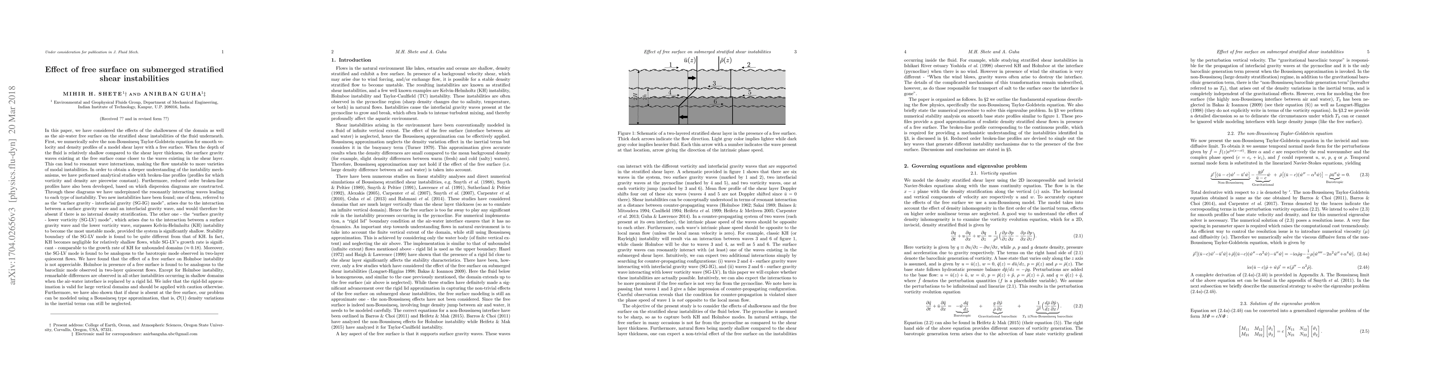 This paper investigates how shallow fluid depth and the air-water free surface affect stratified shear instabilities, revealing two new instabilities: the SG-IG mode from surface and interfacial gravity wave interaction, and the SG-LV mode from surface gravity and lower vorticity wave interaction. The study finds that the rigid-lid approximation is valid for large vertical domains, while the Boussinesq approximation applies when shear is absent at the free surface.