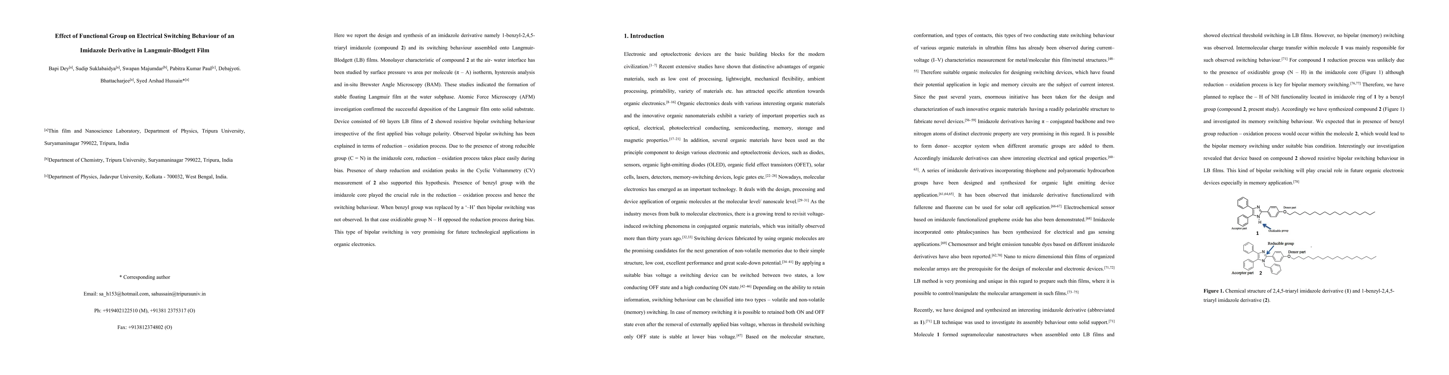 Here we report the design and synthesis of an imidazole derivative namely 1-benzyl-2,4,5-triaryl imidazole and its switching behaviour assembled onto Langmuir-Blodgett films. Monolayer characteristic of imidazole at the air-water interface has been studied by surface pressure vs area per molecule isotherm, hysteresis analysis and insitu Brewster Angle Microscopy . These studies indicated the formation of stable floating Langmuir film at the water subphase. Atomic Force Microscopy investigation confirmed the successful deposition of the Langmuir film onto solid substrate. Device consisted of 60 layers LB films of imidazole showed resistive bipolar switching behaviour irrespective of the first applied bias voltage polarity. Observed bipolar switching has been explained in terms of reduction oxidation process. Due to the presence of strong reducible group C double bond N in the imidazole core, reduction oxidation process takes place easily during bias. Presence of sharp reduction and oxidation peaks in the Cyclic Voltammetry measurement of 2 also supported this hypothesis. Presence of benzyl group with the imidazole core played the crucial rule in the reduction oxidation process and hence the switching behaviour. When benzyl group was replaced by a H then bipolar switching was not observed. In that case oxidizable group NH opposed the reduction process during bias. This type of bipolar switching is very promising for future technological applications in organic electronics.