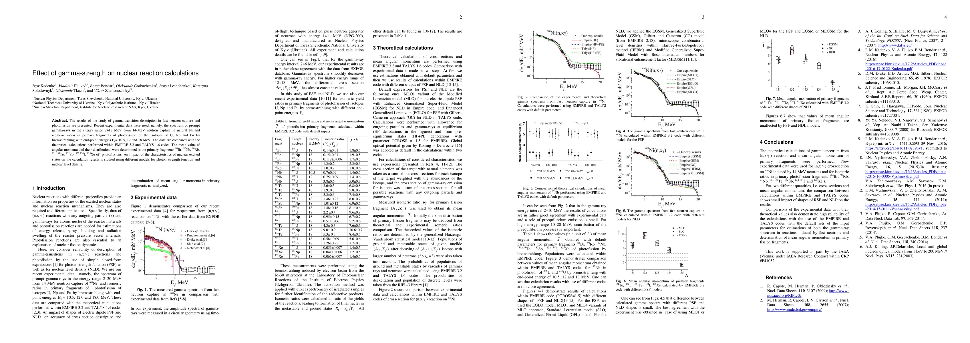 The results of the study of gamma-transition description in fast neutron capture and photofission are presented. Recent experimental data were used, namely, the spectrum of prompt gamma-rays in the energy range 2{\div}18 MeV from 14-MeV neutron capture in natural Ni and isomeric ratios in primary fragments of photofission of the isotopes of U, Np and Pu by bremsstrahlung with end-point energies $E_e$= 10.5, 12 and 18 MeV. The data are compared with the theoretical calculations performed within EMPIRE 3.2 and TALYS 1.6 codes. The mean value of angular momenta and their distributions were determined in the primary fragments $^{84}$Br, $^{97}$Nb, $^{90}$Rb, $^{131,133}$Te, $^{132}$Sb, $^{132,134}$I, $^{135}$Xe of photofissions. An impact of the characteristics of nuclear excited states on the calculation results is studied using different models for photon strength function and nuclear level density.