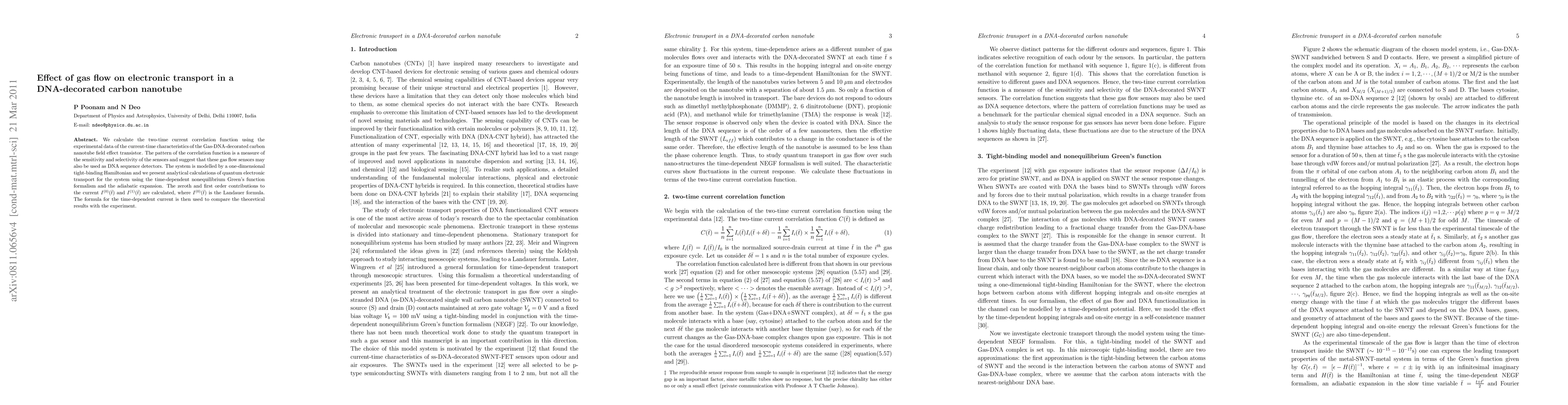 This paper investigates the electronic transport in a DNA-decorated carbon nanotube under varying gas flow conditions using experimental data. It models the system with a one-dimensional tight-binding Hamiltonian and employs quantum transport theory to calculate current correlations, suggesting the potential for these sensors to detect both gas and DNA sequences.