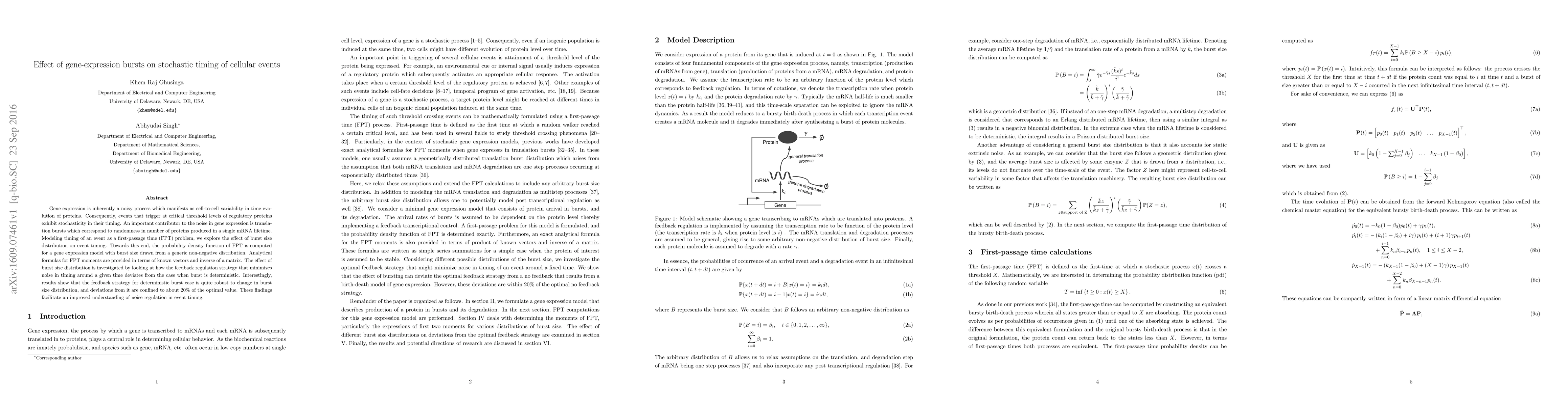 This paper investigates how gene-expression bursts affect the stochastic timing of cellular events, modeling the first-passage time problem. The study finds that while burst size distribution impacts event timing, the feedback regulation strategy remains robust, with deviations only around 20% from optimal values.