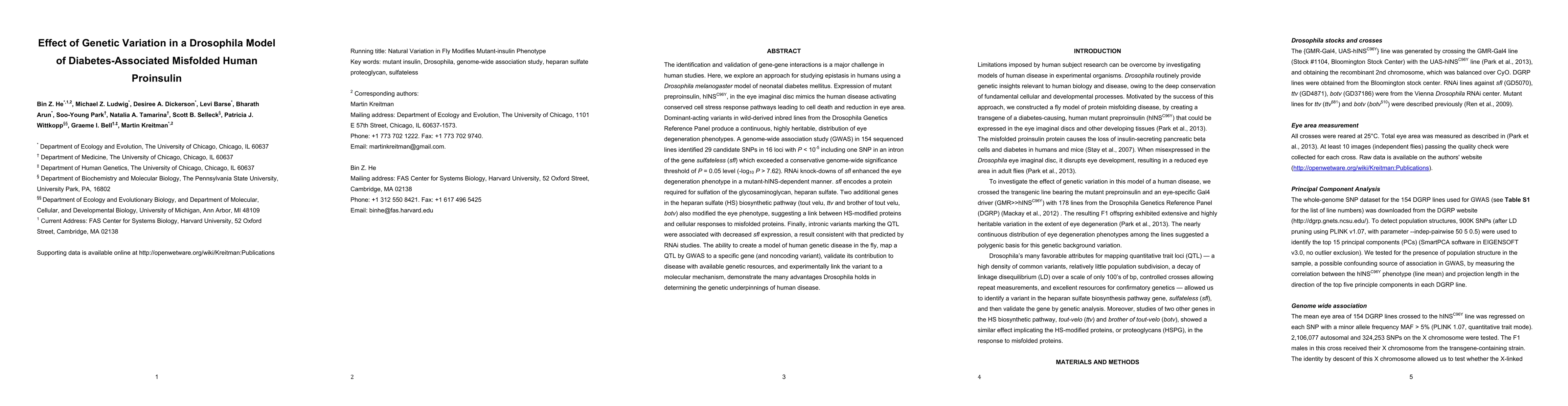 This study uses a Drosophila model to identify gene-gene interactions affecting diabetes-associated misfolded human proinsulin, revealing a significant QTL linked to the sulfateless gene (sfl). The findings suggest a role for heparan sulfate biosynthetic pathway genes in cellular responses to misfolded proteins, highlighting Drosophila's utility in human disease genetics research.