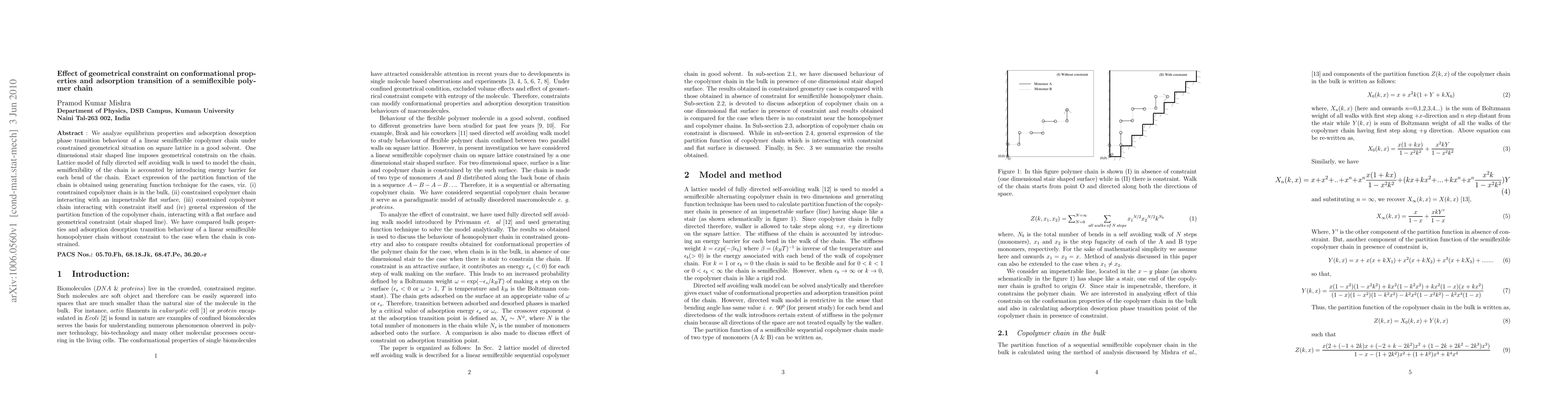 This paper investigates the conformational properties and adsorption-desorption phase transition of a semiflexible polymer chain under geometrical constraints on a square lattice. Using a lattice model, the authors derive exact partition functions and compare the constrained copolymer chain's behavior to that of an unconstrained homopolymer chain.