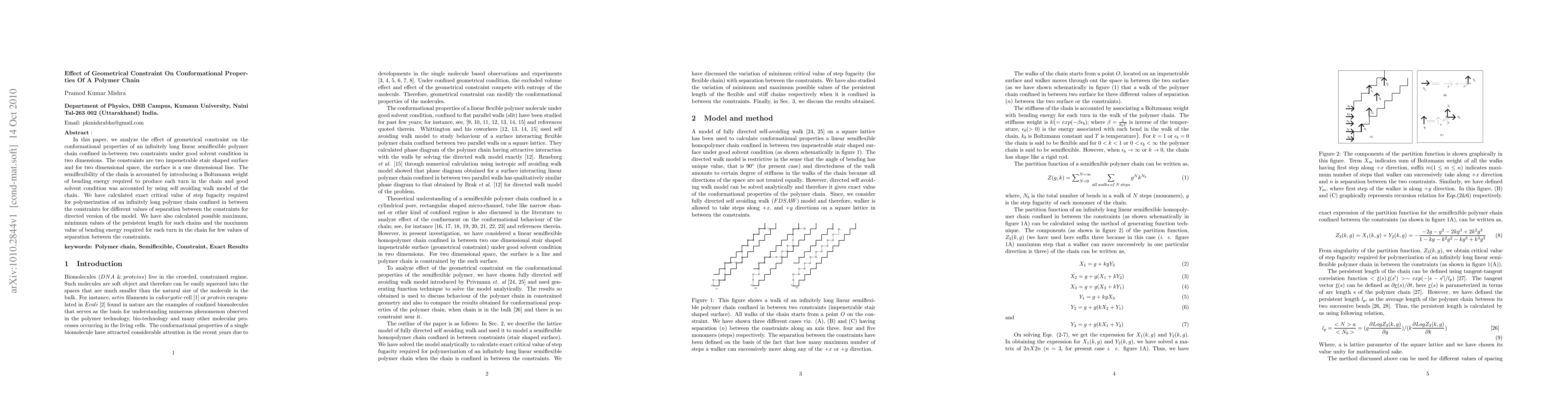 In this paper, we analyze the effect of geometrical constraint on the conformational properties of an infinitely long linear semiflexible polymer chain confined in-between two constraints under good solvent condition in two dimensions. The constraints are two impenetrable stair shaped surface and for two dimensional space, the surface is a one dimensional line. The semiflexibility of the chain is accounted by introducing a Boltzmann weight of bending energy required to produce each turn in the chain and good solvent condition was accounted by using self avoiding walk model of the chain. We have calculated exact critical value of step fugacity required for polymerization of an infinitely long polymer chain confined in between the constraints for different values of separation between the constraints for directed version of the model. We have also calculated possible maximum, minimum values of the persistent length for such chains and the maximum value of bending energy required for each turn in the chain for few values of separation between the constraints.