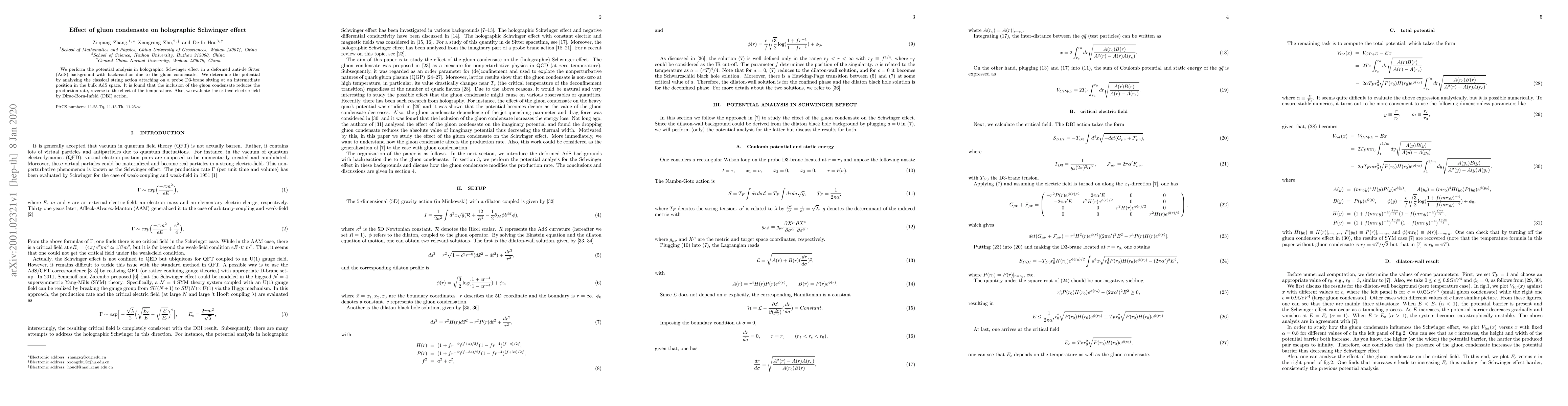 We perform the potential analysis in holographic Schwinger effect in a deformed anti-de Sitter (AdS) background with backreaction due to the gluon condensate. We determine the potential by analyzing the classical string action attaching on a probe D3-brane sitting at an intermediate position in the bulk AdS space. It is found that the inclusion of the gluon condensate reduces the production rate, reverse to the effect of the temperature. Also, we evaluate the critical electric field by Dirac-Born-Infeld (DBI) action.