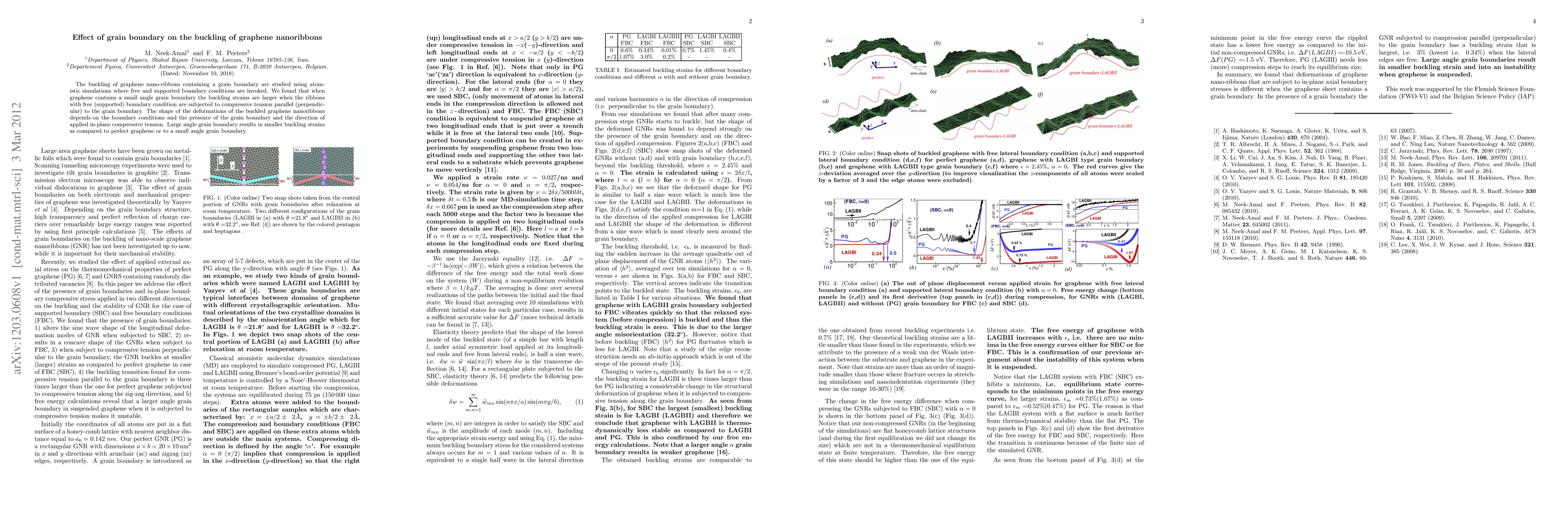 This study investigates the impact of grain boundaries on the buckling behavior of graphene nanoribbons via atomistic simulations. Results show that small angle grain boundaries increase buckling strains under compressive tension parallel to the boundary, while large angle grain boundaries lead to reduced buckling strains compared to perfect graphene.