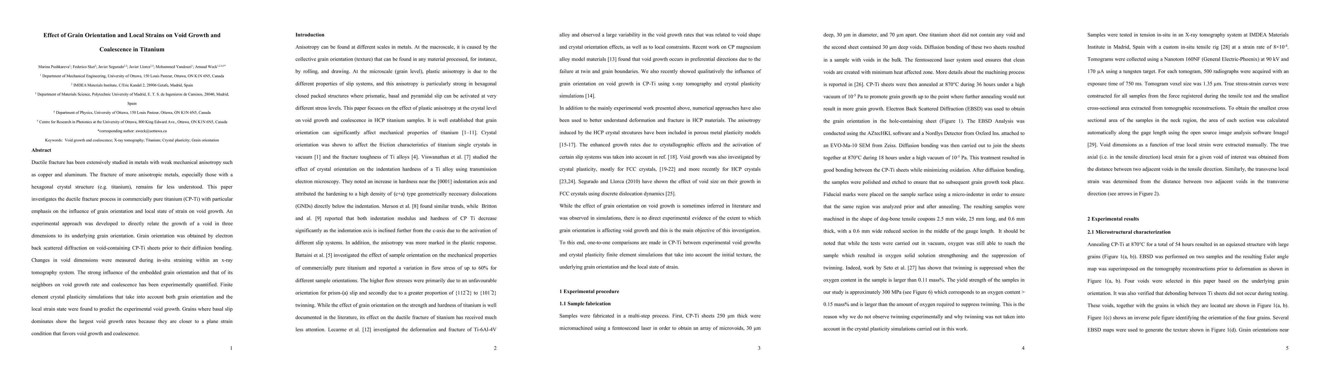 This paper investigates the ductile fracture in titanium by examining how grain orientation and local strains influence void growth and coalescence. Experimental and simulation results show that grains where basal slip dominates exhibit the highest void growth rates, favoring void growth and coalescence under plane strain conditions.