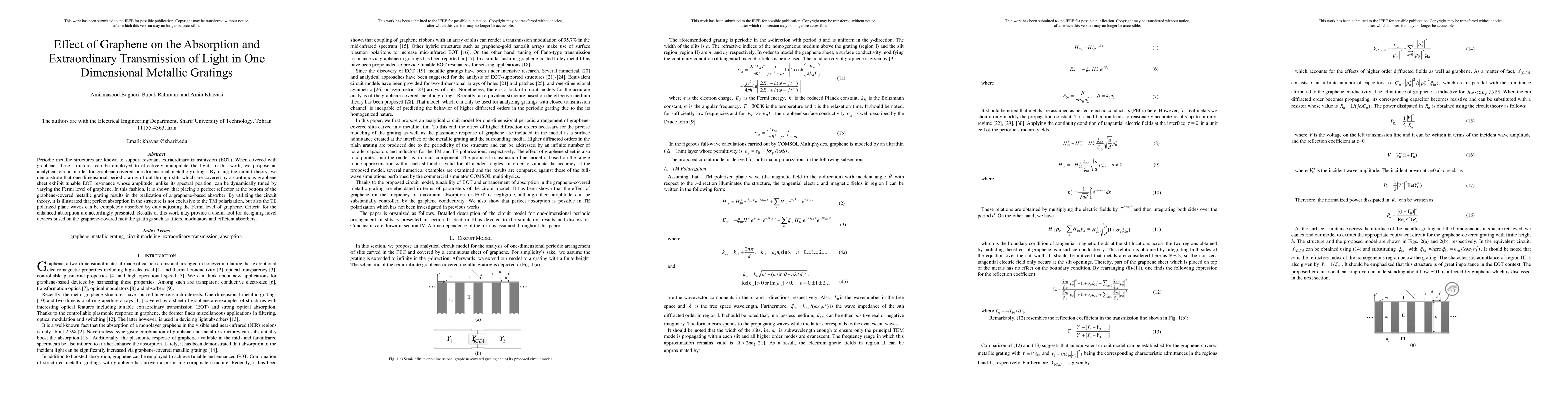 This paper proposes an analytical circuit model for graphene-covered one-dimensional metallic gratings, demonstrating tunable extraordinary optical transmission and perfect absorption by dynamically adjusting the Fermi level of graphene. The findings suggest potential applications in designing advanced optical devices like filters, modulators, and absorbers.
