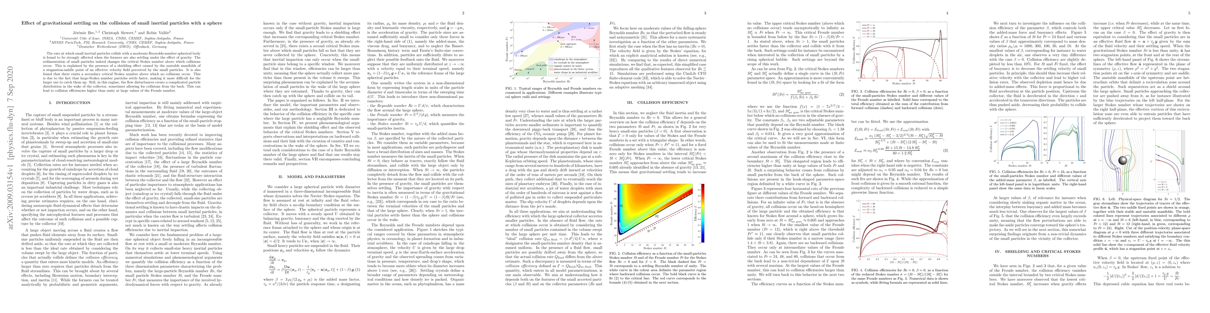 Research shows that gravity affects collisions between small particles and a sphere, changing critical Stokes numbers for collision occurrence. Large particles can settle too fast to catch up with smaller ones, but wake disturbances sometimes allow back-side collisions.