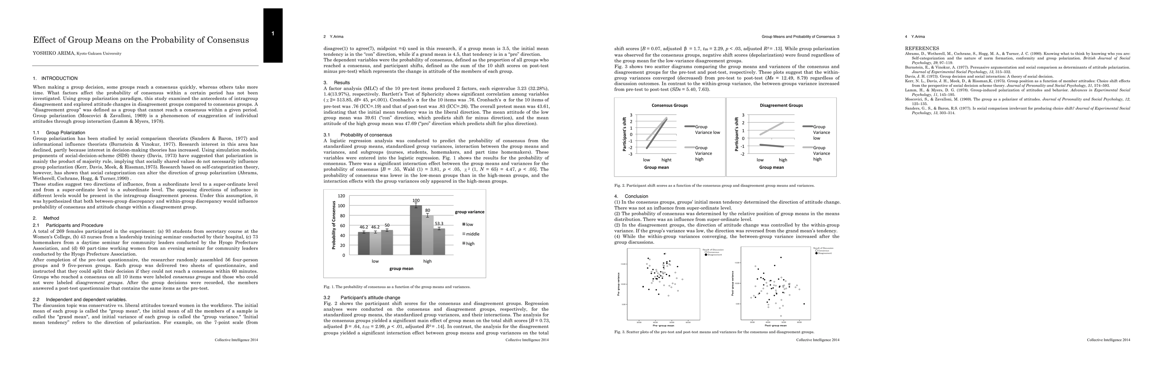 In this study, groups who could not reach a consensus were investigated using the group polarization paradigm. The purpose was to explore the conditions leading to intragroup disagreement and attitude change following disagreement among 269 participants. Analysis indicated that the probability of consensus was low when the group means differed from the grand mean of the entire sample. When small differences among group members were found, depolarization (reverse direction of polarization) followed disagreement. These results suggested the groups which deviated most from the population tendency were the most likely to cause within-group disagreement, while within-group variances determined the direction of attitude change following disagreement within the group.