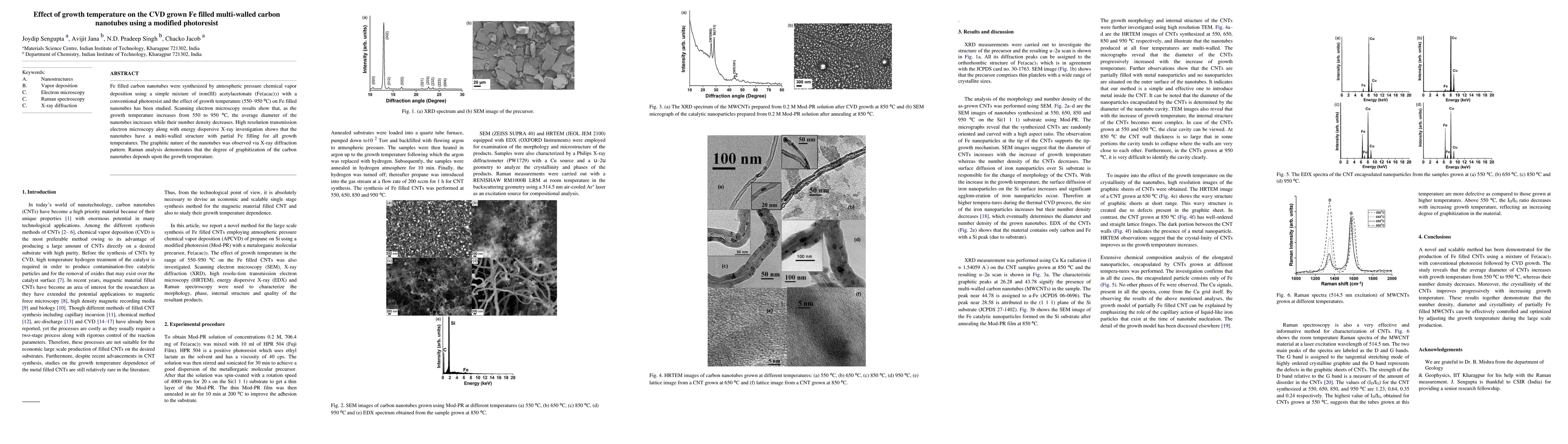 This study investigates the impact of growth temperature on Fe-filled multi-walled carbon nanotubes synthesized via atmospheric pressure CVD using a modified photoresist. Results indicate that higher growth temperatures increase nanotube diameter and decrease their density, while the degree of graphitization varies with temperature.
