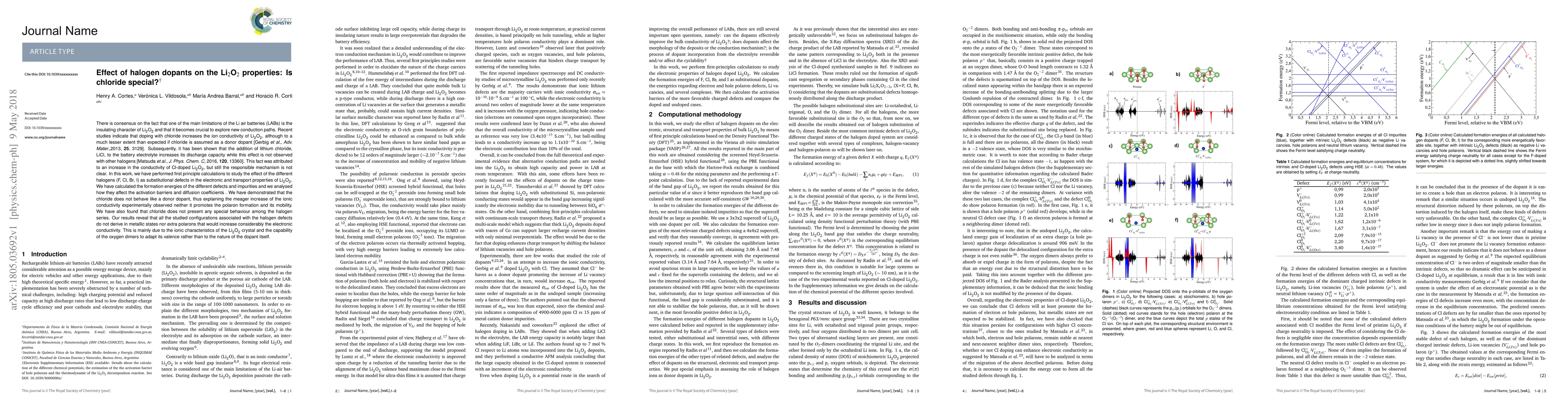 There is consensus on the fact that one of the main limitations of the Li air batteries (LABs) is the insulating character of Li$_{2}$O$_{2}$ and that it becomes crucial to explore new conduction paths. Recent studies indicate that doping with chloride increases the ion conductivity of Li$_{2}$O$_{2}$, although to a much lesser extent than expected if chloride is assumed as a donor dopant [Gerbig et al., Adv. Mater.,2013, 25, 3129]. Subsequently, it has been shown that the addition of lithium chloride, LiCl, to the battery electrolyte increases its discharge capacity while this effect is not observed with other halogens [Matsuda et al., J. Phys. Chem. C, 2016, 120, 13360]. This fact was attributed to an increase in the conductivity of Cl-doped Li$_{2}$O$_{2}$, but still the responsible mechanism is not clear. In this work, we have performed first principle calculations to study the effect of the different halogens (F, Cl, Br, I) as substitutional defects in the electronic and transport properties of Li$_{2}$O$_{2}$. We have calculated the formation energies of the different defects and impurities and we analysed how they affect the activation barriers and diffusion coefficients . We have demonstrated that the chloride does not behave like a donor dopant, thus explaining the meager increase of the ionic conductivity experimentally observed neither it promotes the polaron formation and its mobility. We have also found that chloride does not present any special behaviour among the halogen series. Our results reveal that all the studied configurations associated with the halogen defects do not derive in metallic states nor extra polarons that would increase considerably the electronic conductivity. This is mainly due to the ionic characteristics of the Li$_{2}$O$_{2}$ crystal and the capability of the oxygen dimers to adapt its valence rather than to the nature of the dopant itself.